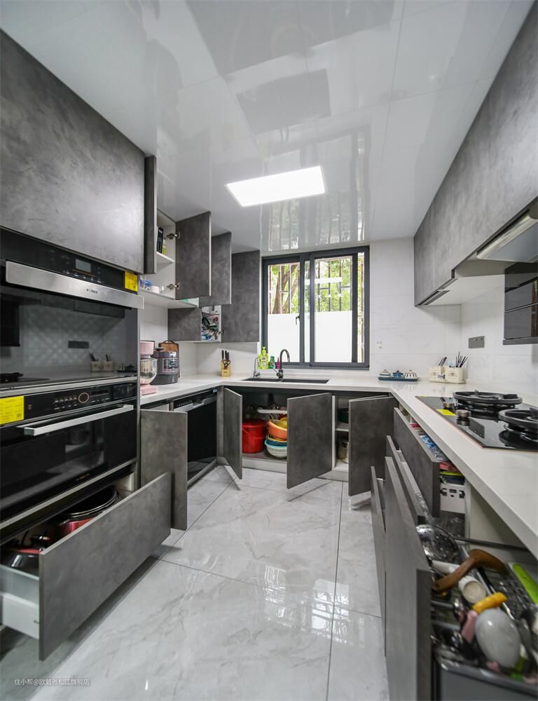 ▲U型厨房结构不仅有宽敞的活动空间,大量的橱柜和抽屉也为厨房提供了强大的收纳。 ▲“洗切炒”三区合理划分后,动线更加流畅,高效提升烹饪效率!
