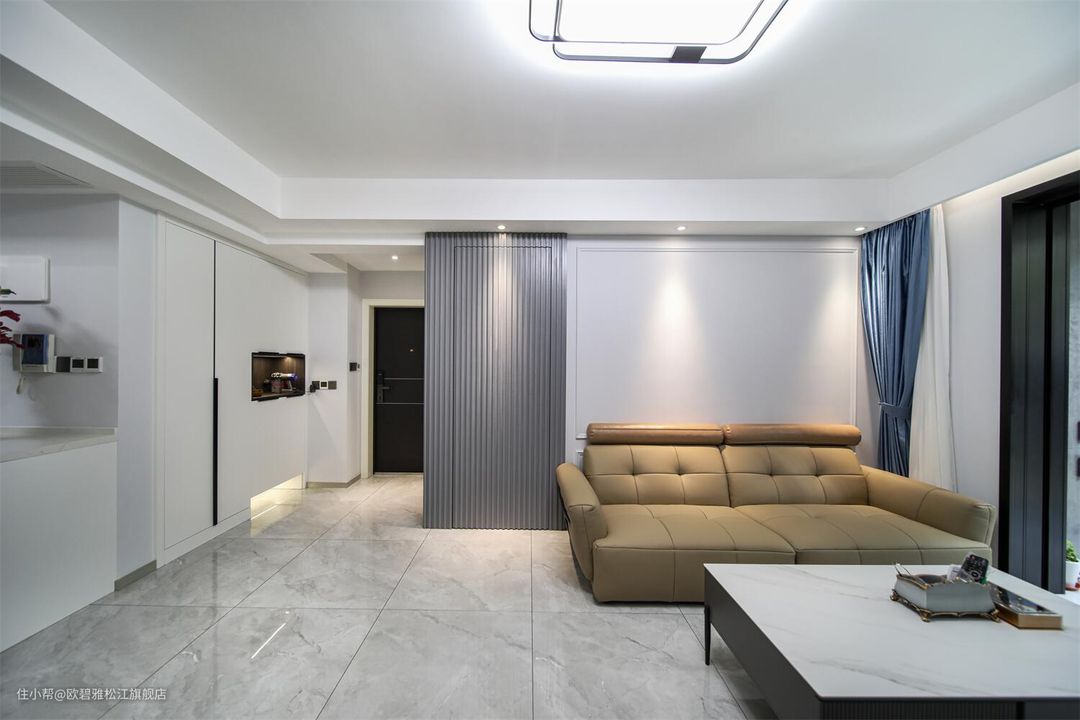 ▲玄关延伸至沙发背景墙处,设计了一面木格栅护墙板,利用其独特的线条,使居室平开门可以巧妙达到“隐藏”的效果。 ▲浅灰色木格栅搭配卡其色皮革沙发呈现出一种淡然、素雅的温馨感。