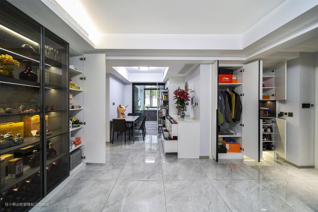 ▲两侧按压式柜门省去拉手与墙面完美衔接,整洁性更强;中间柜体利用隔板将内部空间分隔多层,搭配隐藏的灯带光源和灰玻给居室带来精致、优雅的高级感。