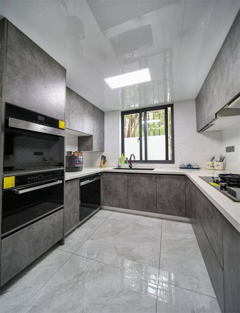 ▲不得不说,厨房的配色真的很有质感,黑白灰搭配纹理丰富的地砖简洁又富有层次感。 ▲墙地砖分别选用同色系的美缝减少空间的突兀感。
