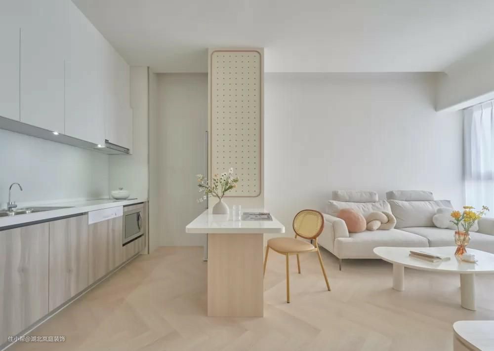 餐厅设计比较简约大气,原木色的单人椅的餐桌组合,在这白色的空间中,无主灯设计像星星一样,打造惬意的用餐环境。