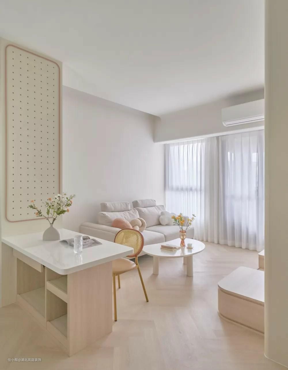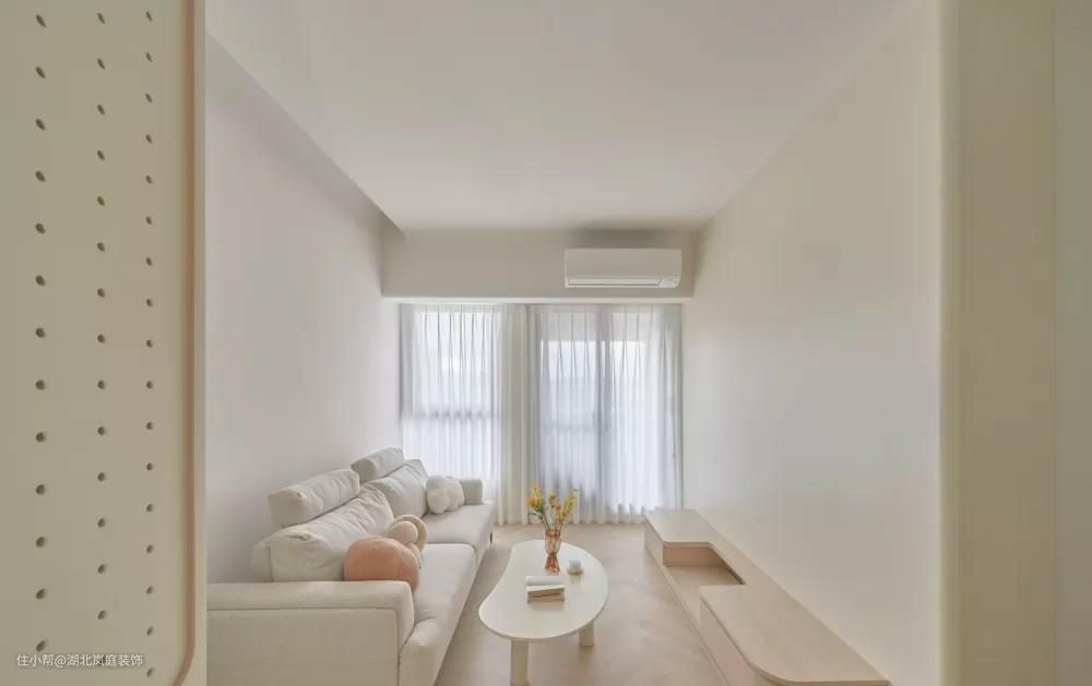 横厅户型,客餐厅一体化设计,凉面都是窗户,采光十足。白色的沙发搭配同色系的茶几,打造一个惬意,有温度的客厅环境。