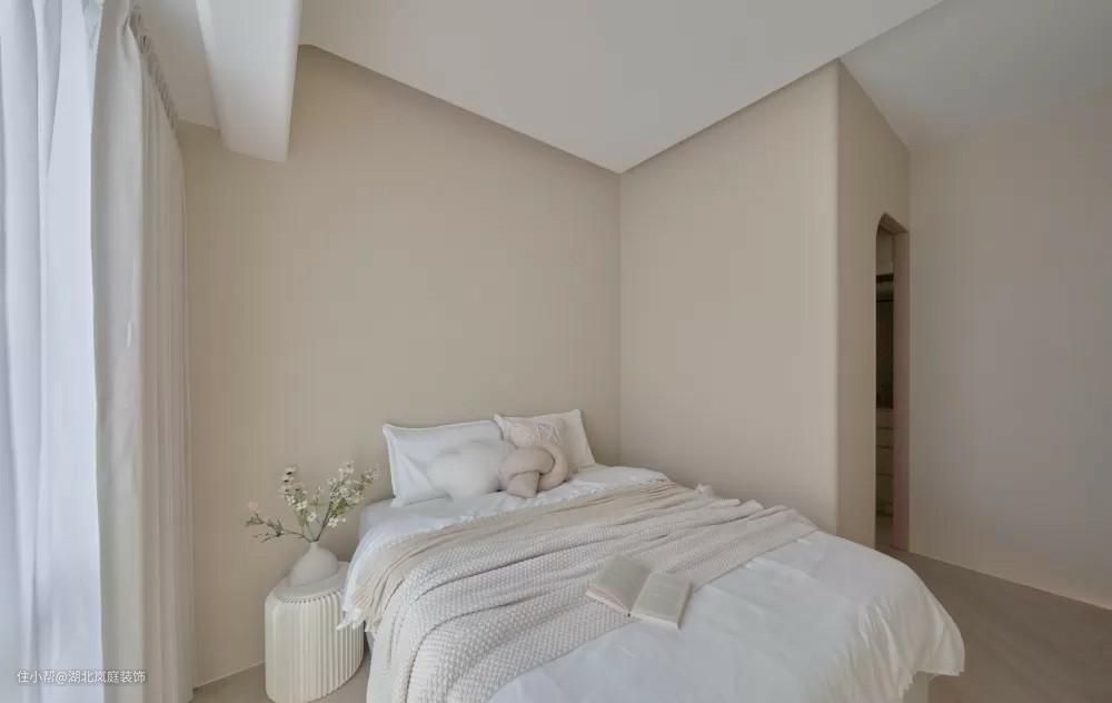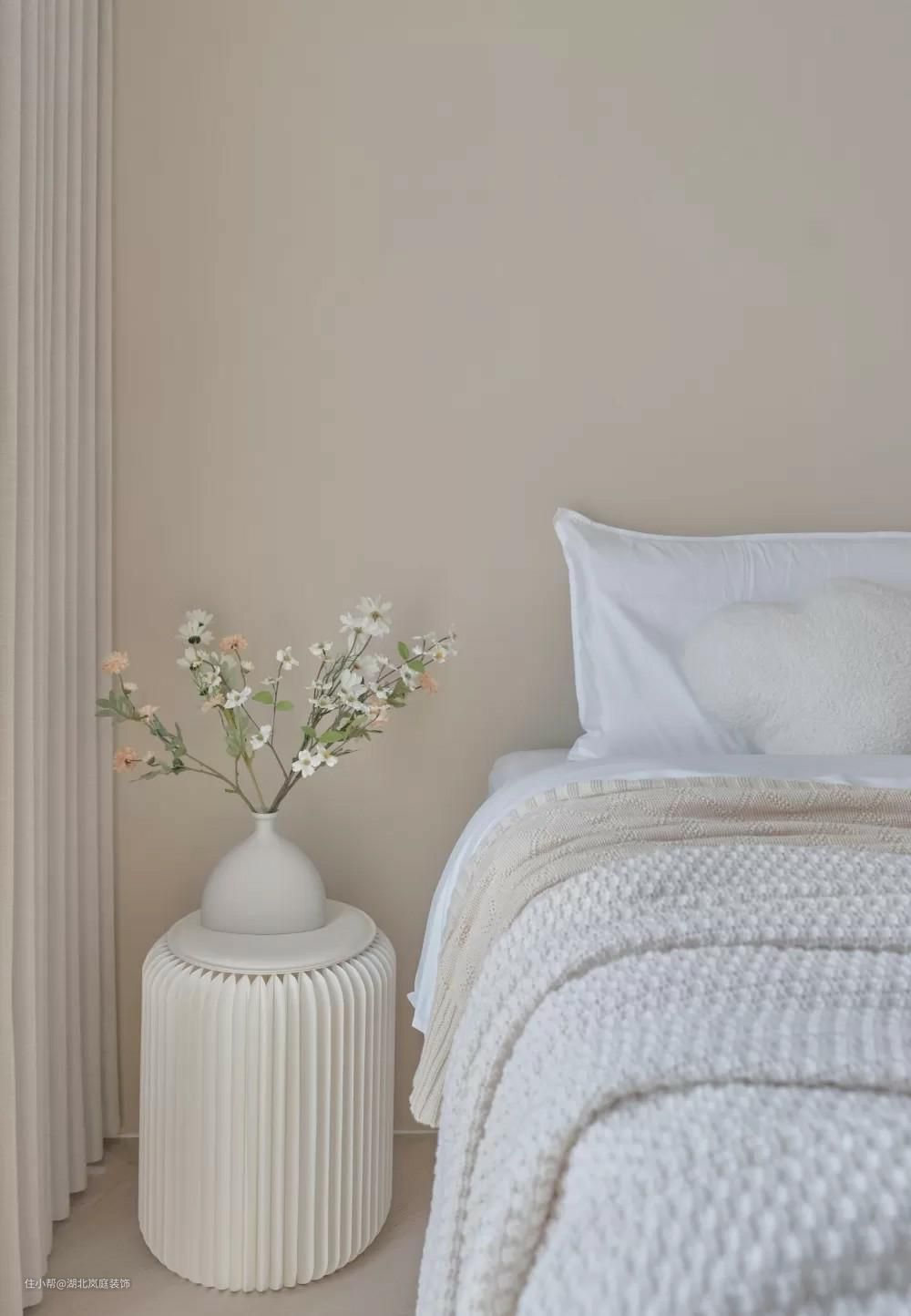 主卧以米色为主,米色的乳胶漆装饰墙面,床头一侧的花瓶精致优雅,卧室与衣帽间相连接,收纳无忧。床上四件套也以同一色系的米色为主,营造舒适的睡眠环境。
