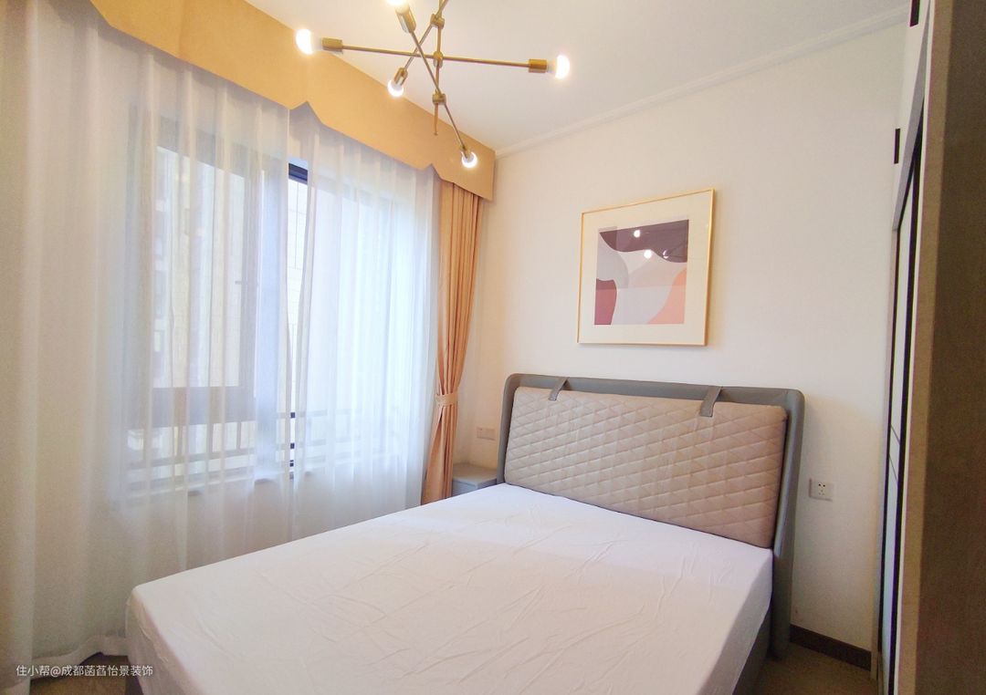 次卧的空间一张简单柔软的双人床,搭配着顶部的吊灯设计,营造出一个精致舒适的休息空间。