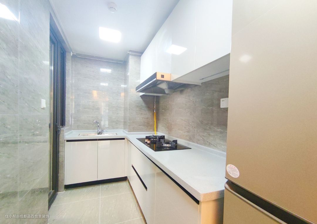 厨房的空间做的L型的操作台,定制的柜子搭配着吊柜的设计,增加空间的收纳面积,厨房连接着外部的生活阳台,为室内带来了充足的采光。