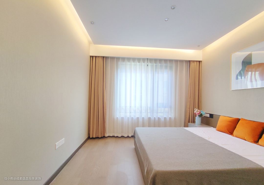 主卧的空间简单开阔,柔软的床品软装搭配着顶部的无主灯设计,增加空间的层次感。给主人带来一个舒适放松的休息环境。