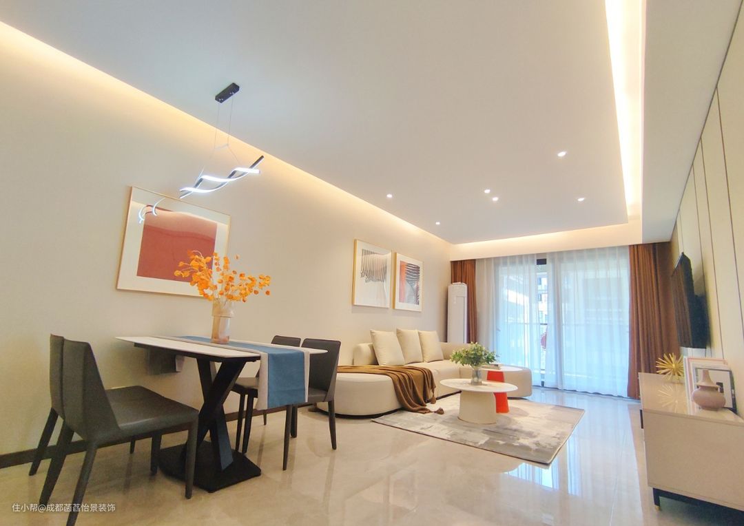 客厅的布置温馨大气,暖色调的灯光搭配着奶白色的墙面漆,营造出一个精致大气的空间氛围。大面积的窗户为室内带来了充足的采光。