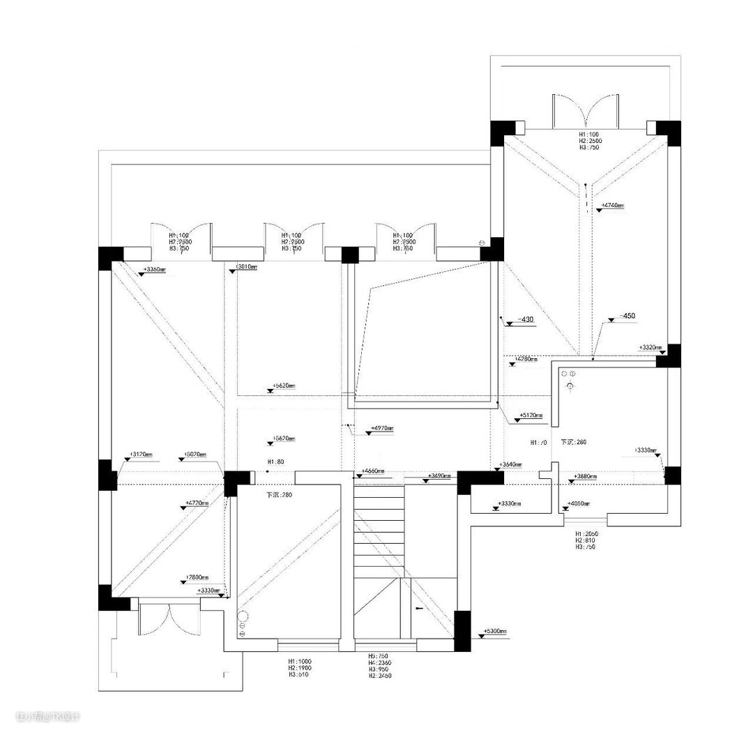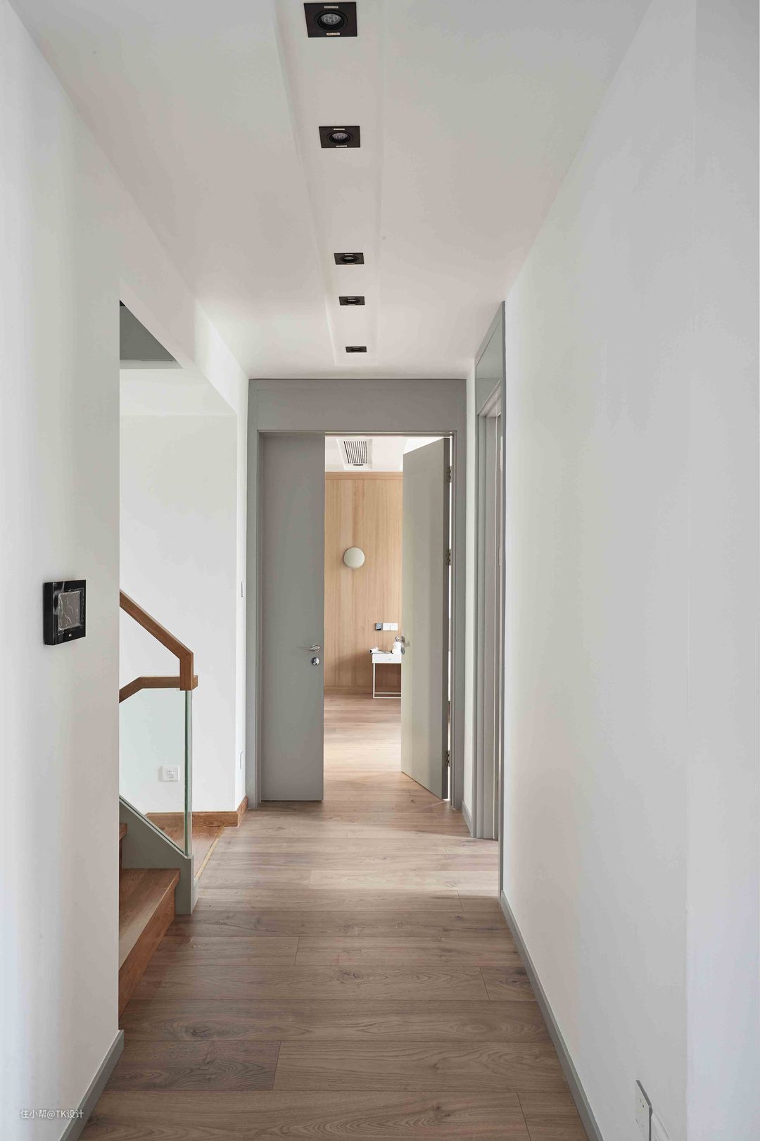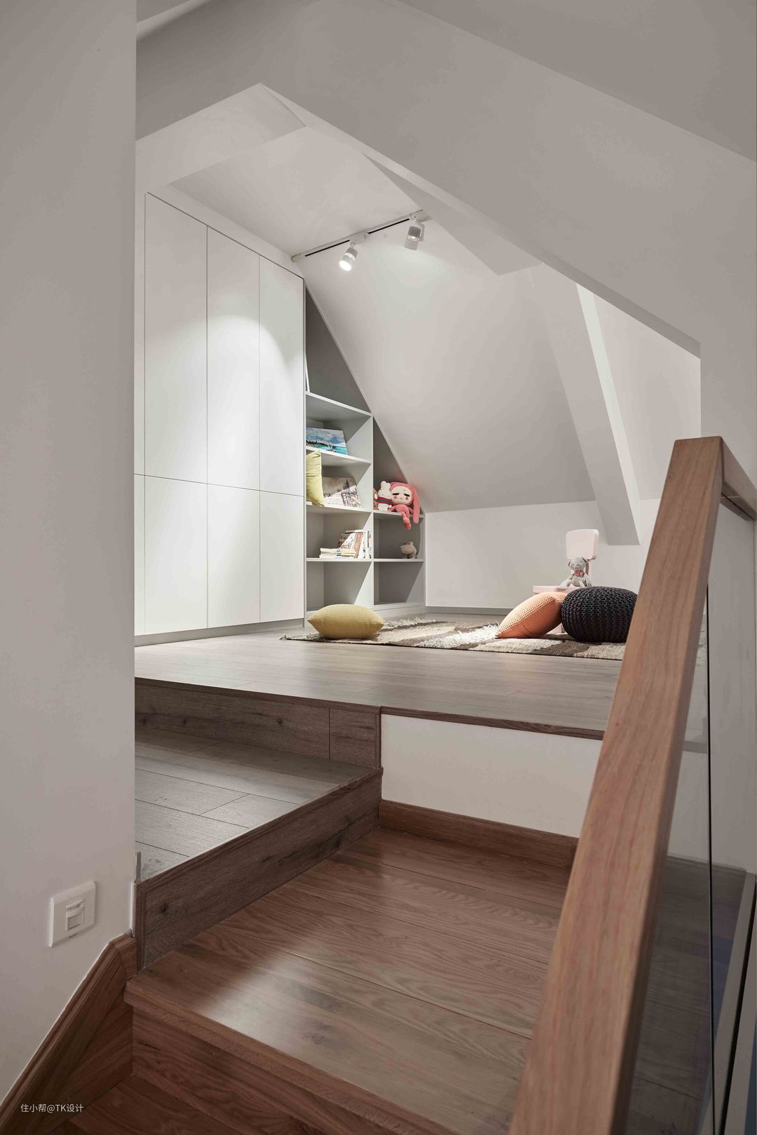 在二楼主卧和儿童房上方搭建出来的小阁楼,作为一小方活动区。 整个楼梯和公共区域轨道都步置了感应灯。