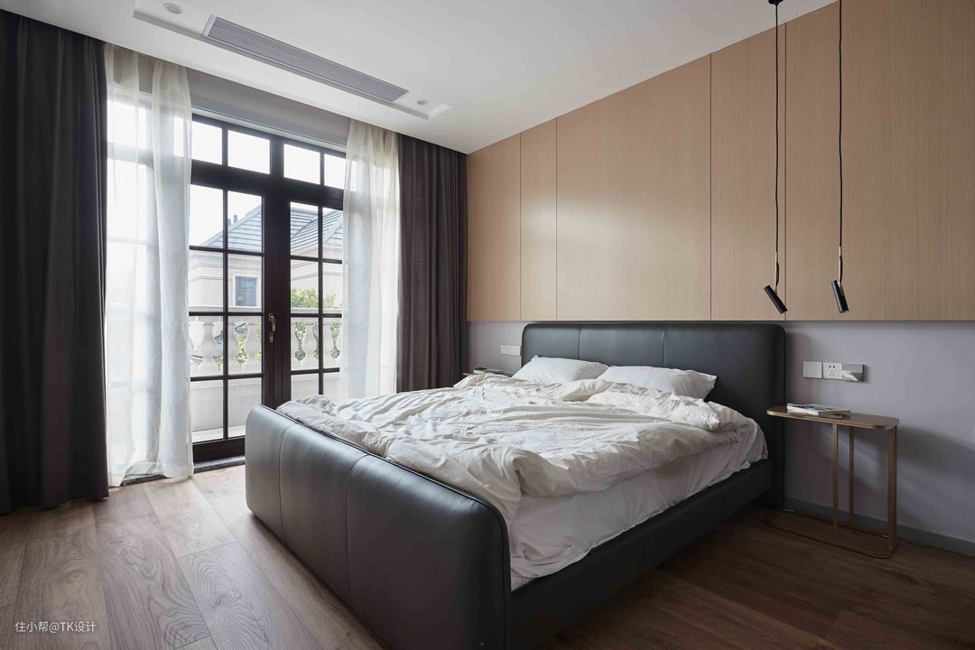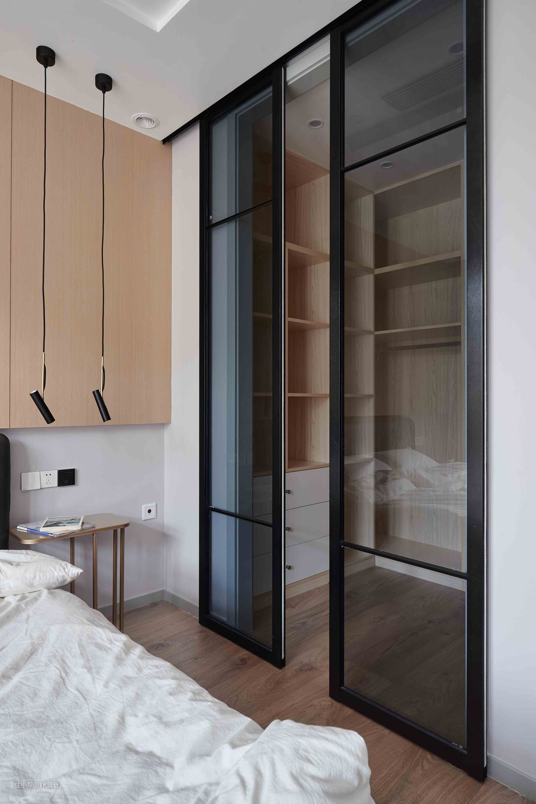 木色与白色营造出自然清新的氛围,移门后是衣帽间。