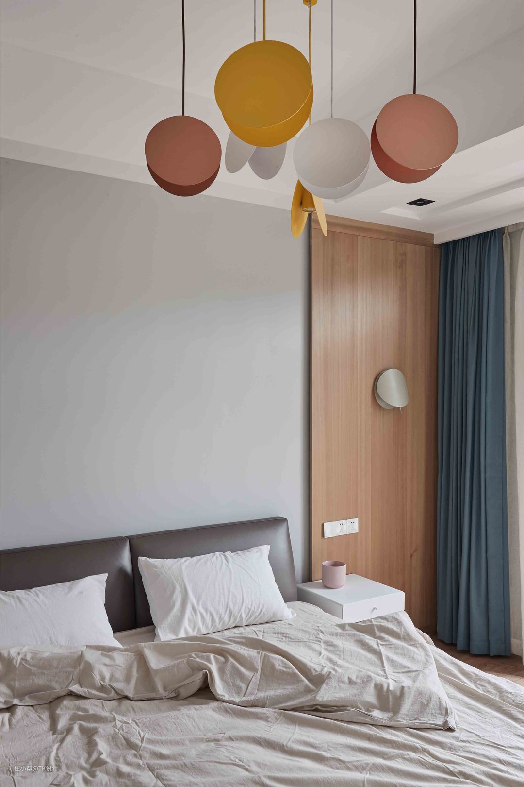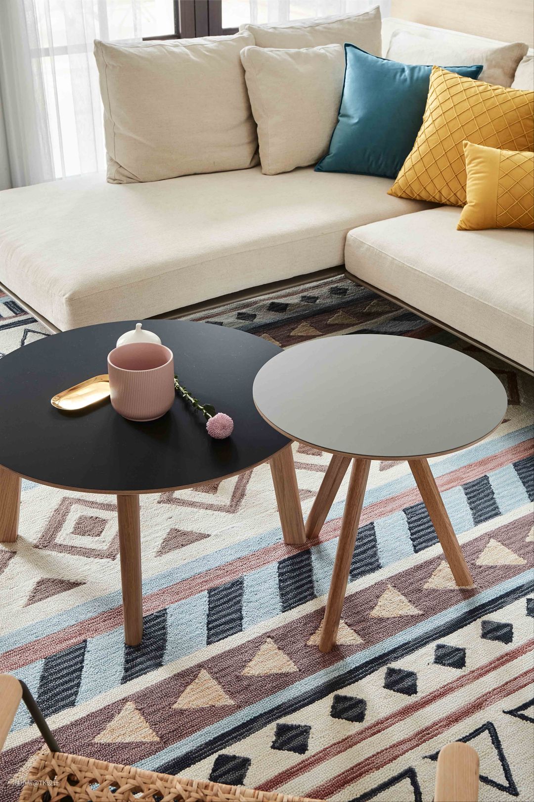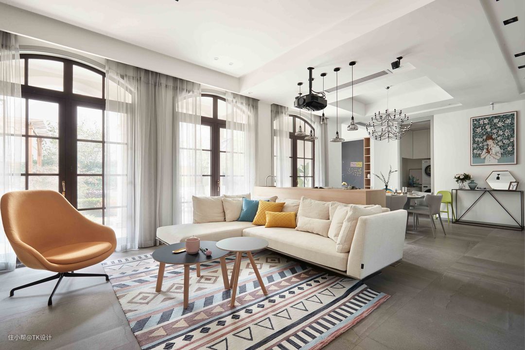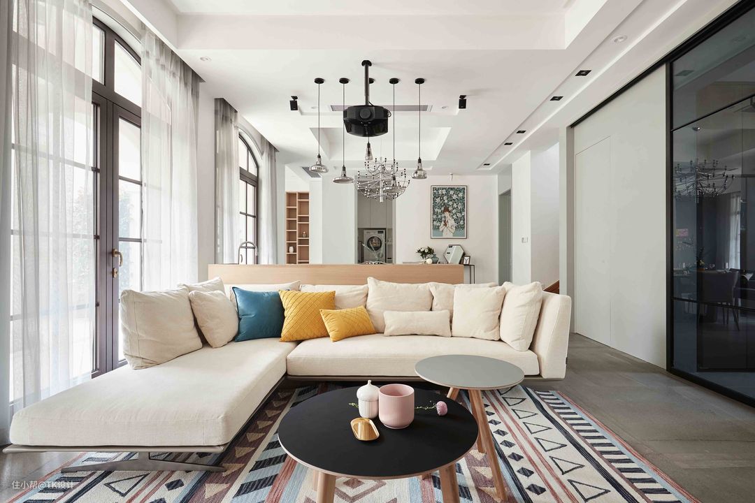 客厅用了浅色大体量沙发,可以满足多人观影。活泼的圆几便于移动和玩游戏。