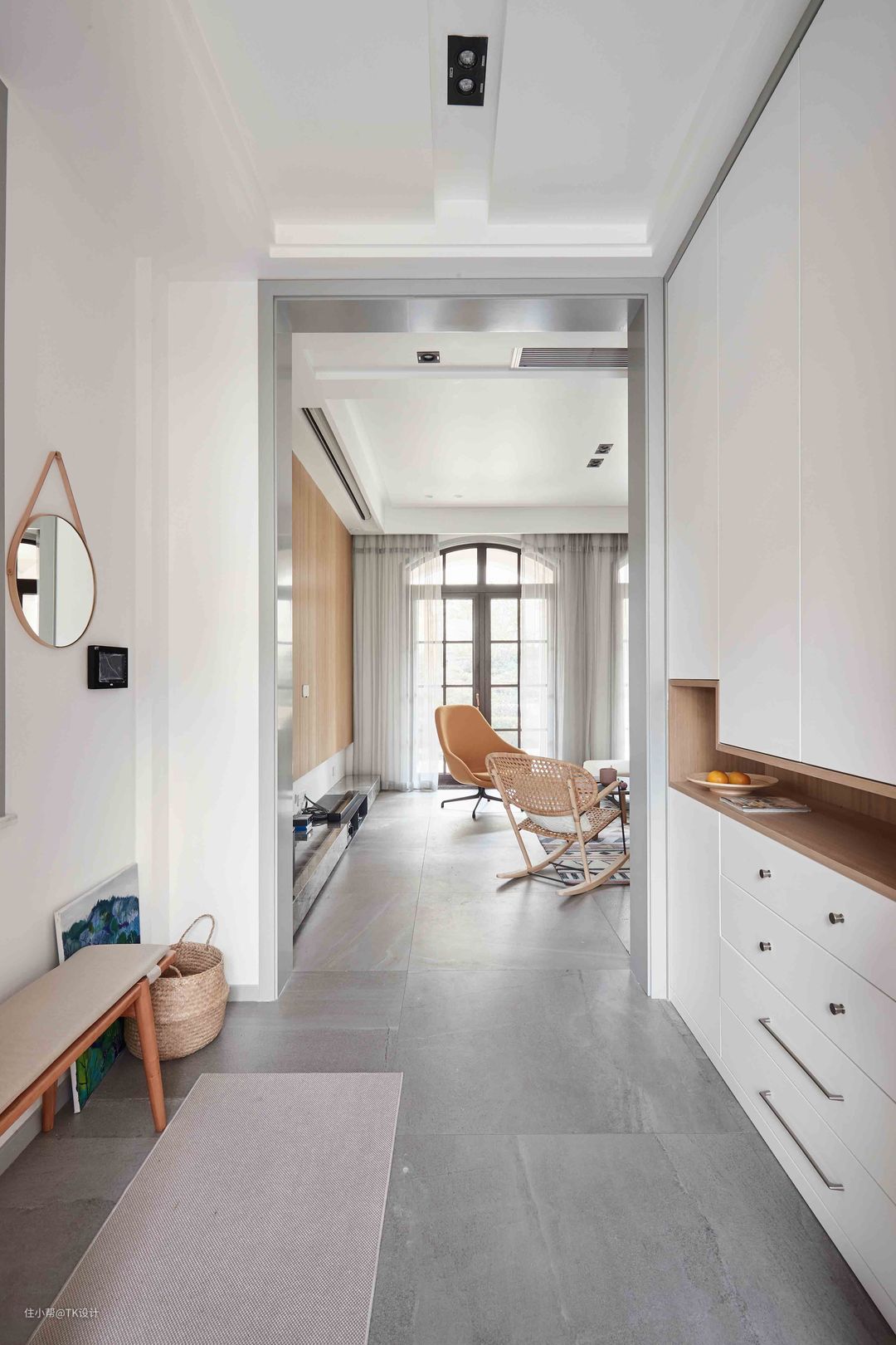 入门玄关,一侧是长凳和衣架,另一侧是整面衣帽柜。