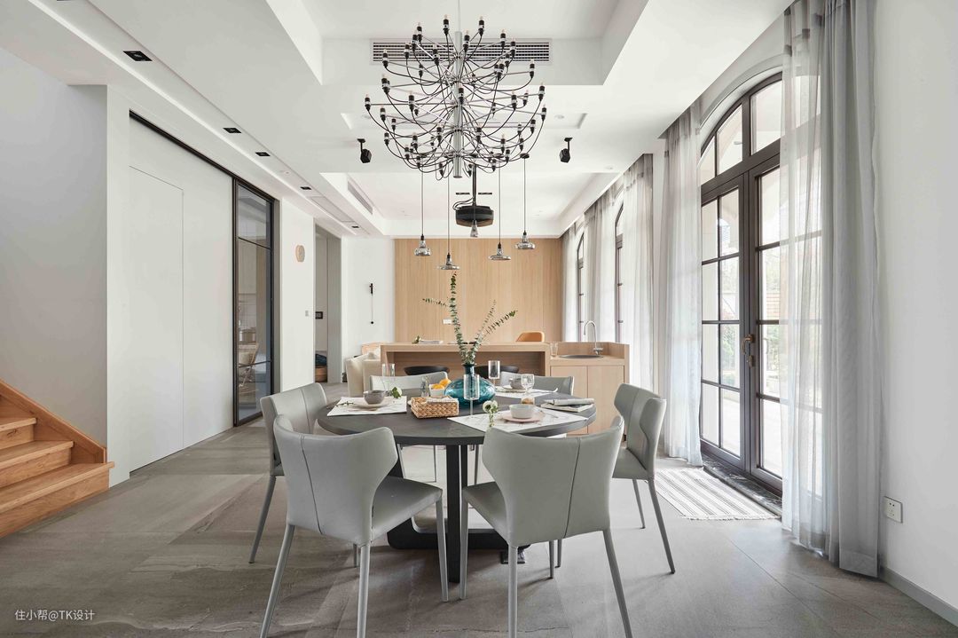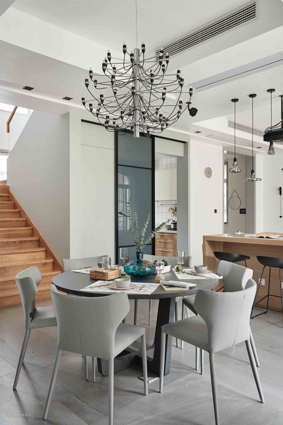 最美的一个角度。 楼梯下作了个储物间的暗门,和厨房的移门门套联合一起。 餐厅的吊灯是整个设计过程中最后选配的,前期没有找到特别满意的单品,反复预构了多次现场效果,最后的效果很赞。