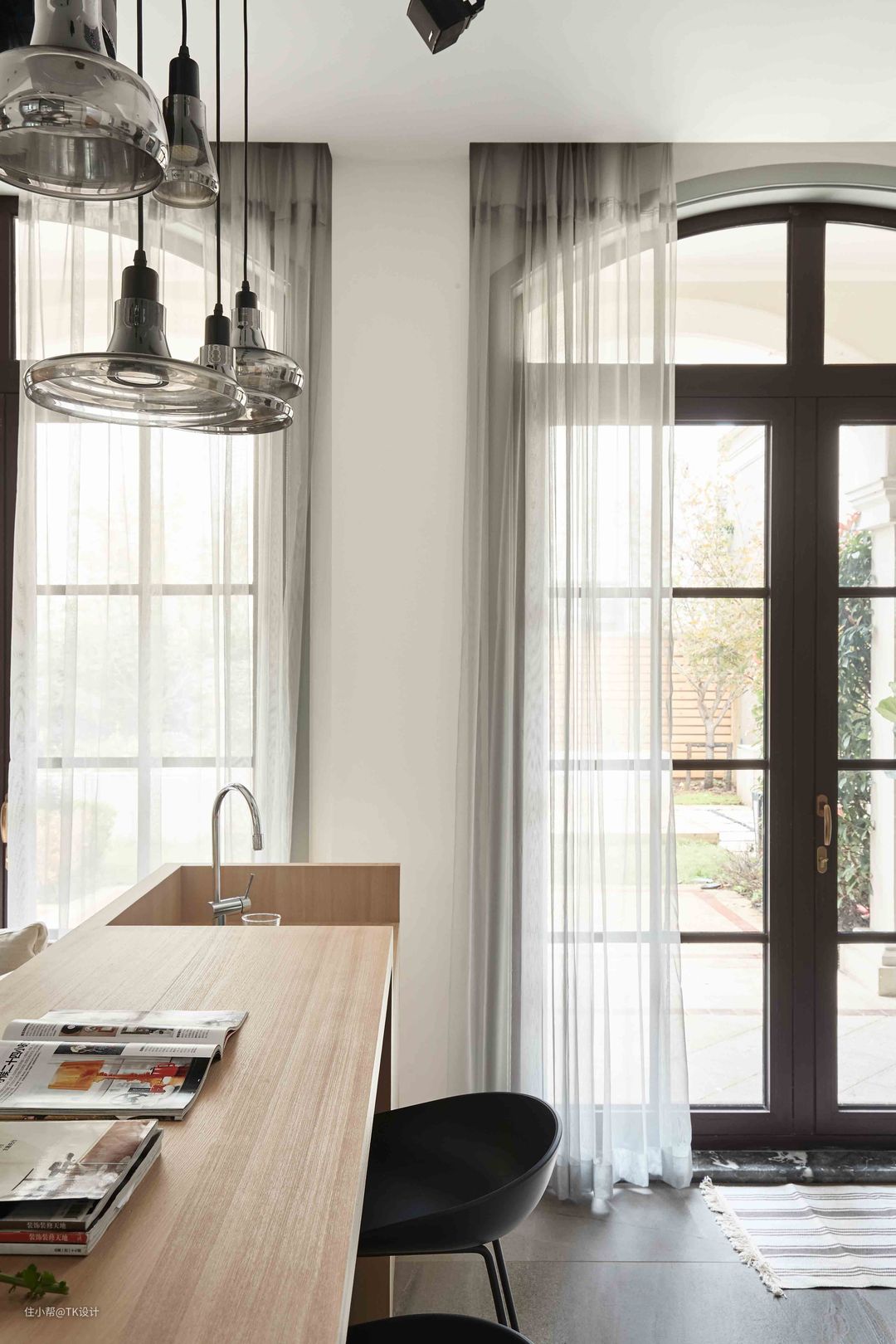 靠近露台的一侧使用玻璃门搭配轻薄的窗帘,采光很棒。