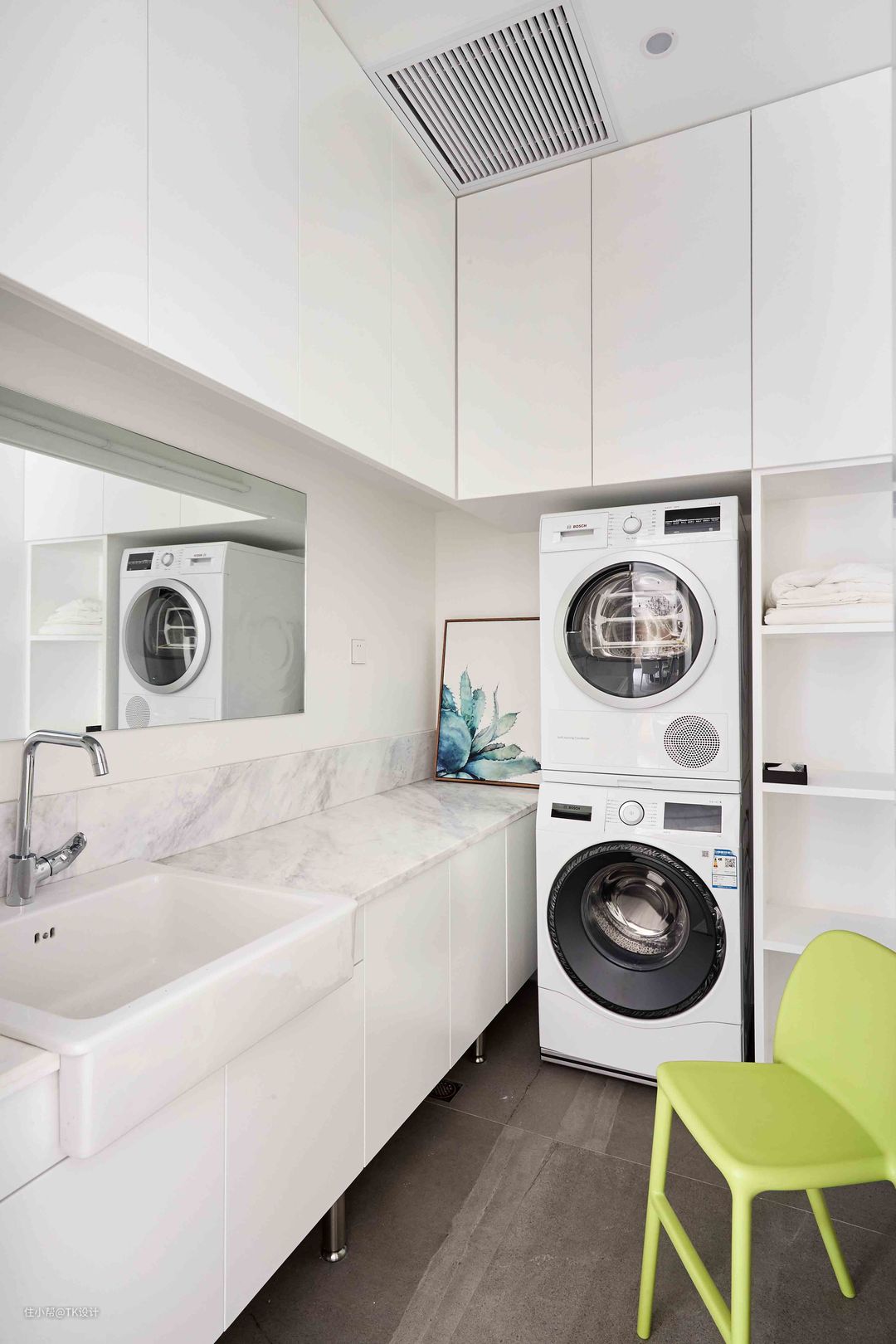 针对客户的实际需求,一楼卫生间的干区兼做洗衣房。 洗衣机与烘干机搭配使用,台盆也采用了可以足够洗衣服的大尺寸。上方吊柜下面加了灯光和挂衣杆。