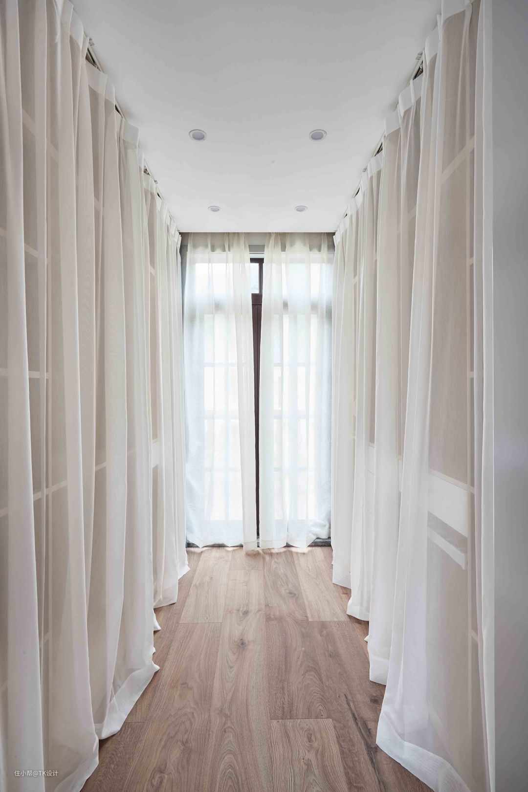 衣帽间是两头开门的格局。一侧和主卧连接,以灰色的玻璃移门作隔断;另一侧连接到一个小露台。 考虑到放置衣物的美观和实用性,衣帽间是开放设计,放弃了柜门,以轻纱作遮挡,视觉上轻柔不压抑。