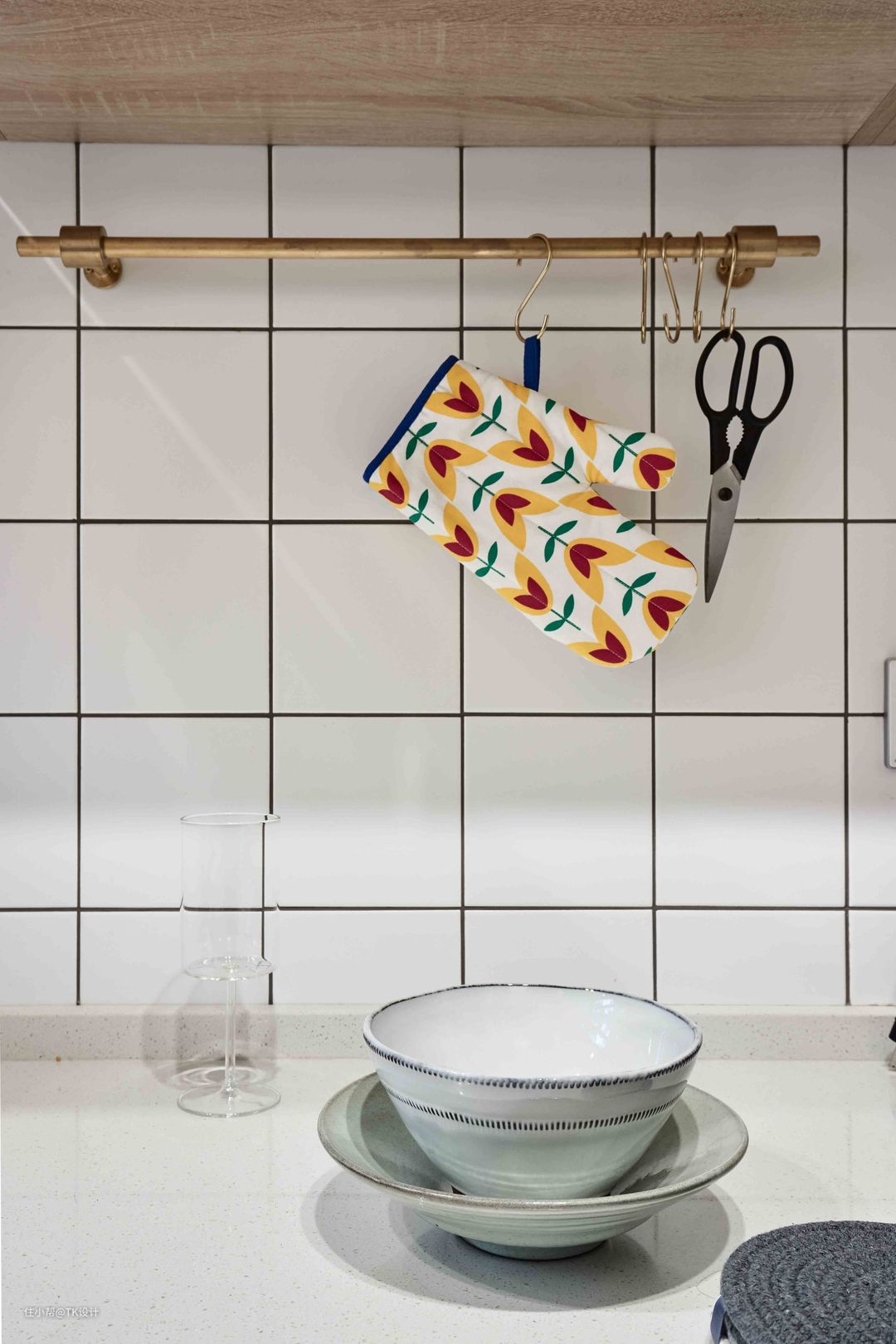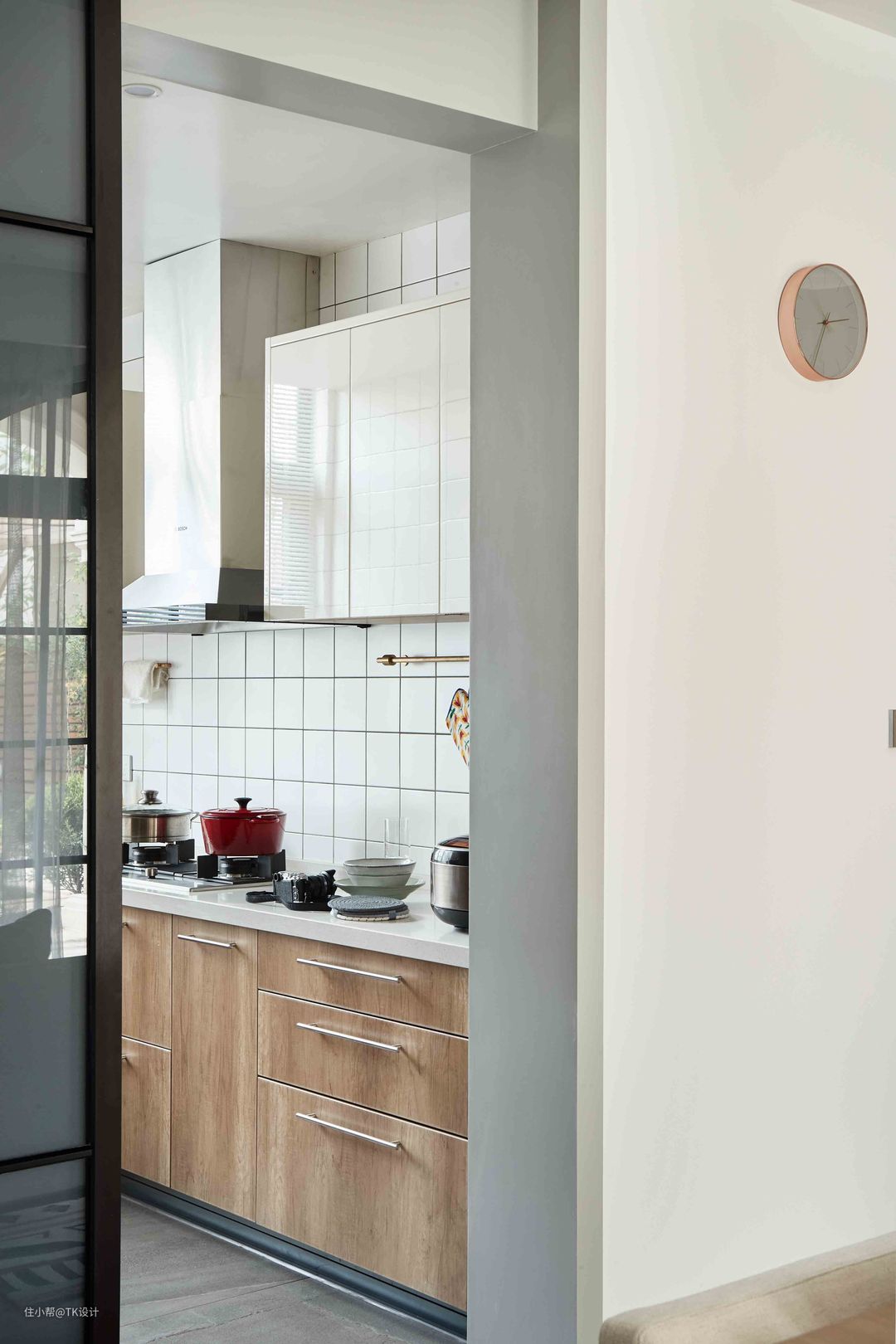 U型厨房。 木色橱柜搭配小白砖,清新简约。