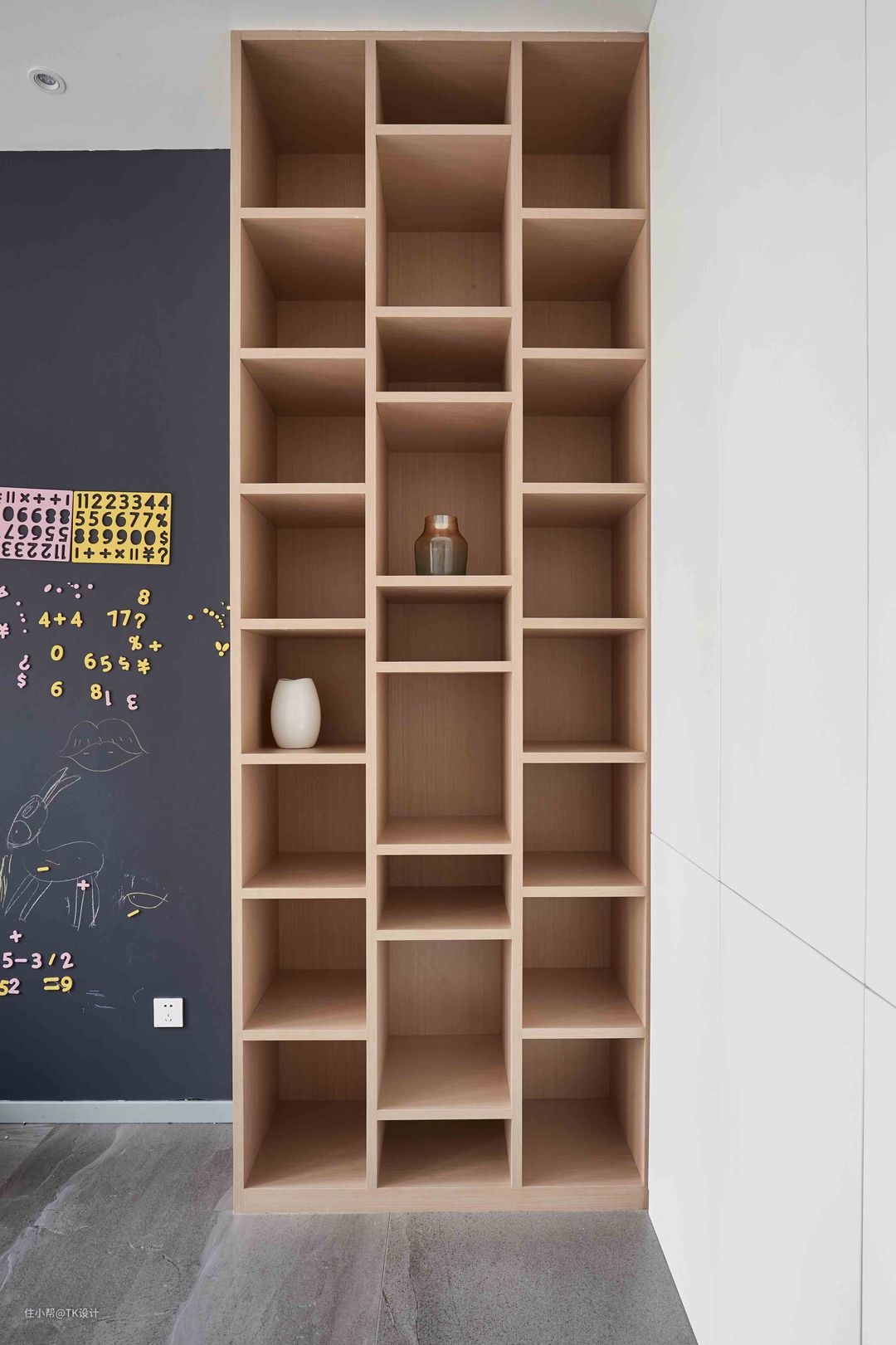 阅读区,刷了一面黑板墙,便于小朋友写写画画。一旁的搁架可放置常看的书籍。