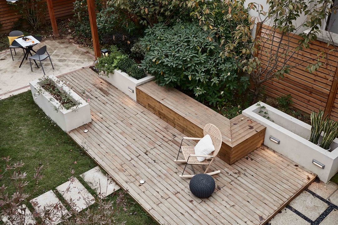 休闲平台。地面铺设了防腐木,无论是地面还是花池侧壁都嵌入了射灯。天色暗下来后,十分有氛围。