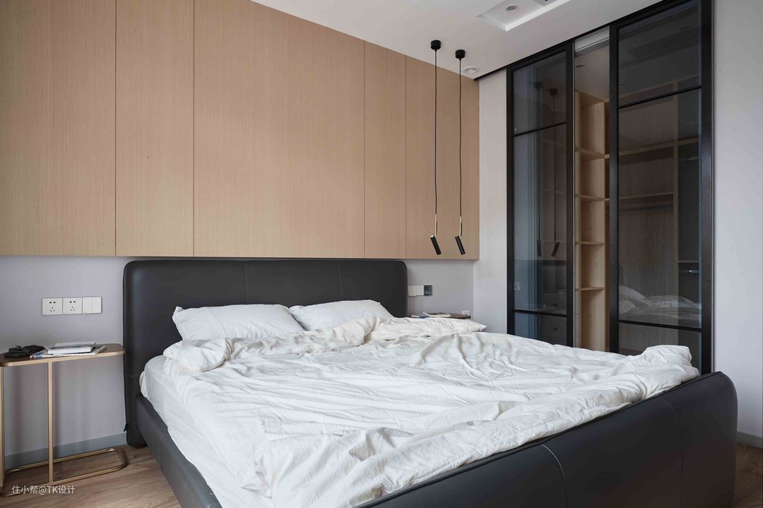 木色与白色营造出自然清新的氛围,移门后是衣帽间。