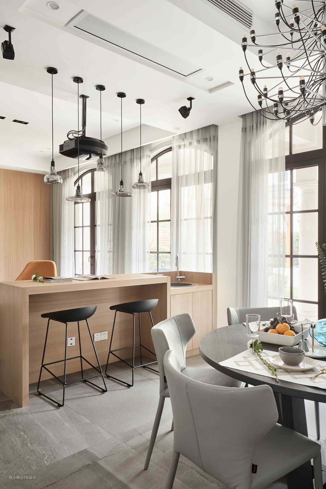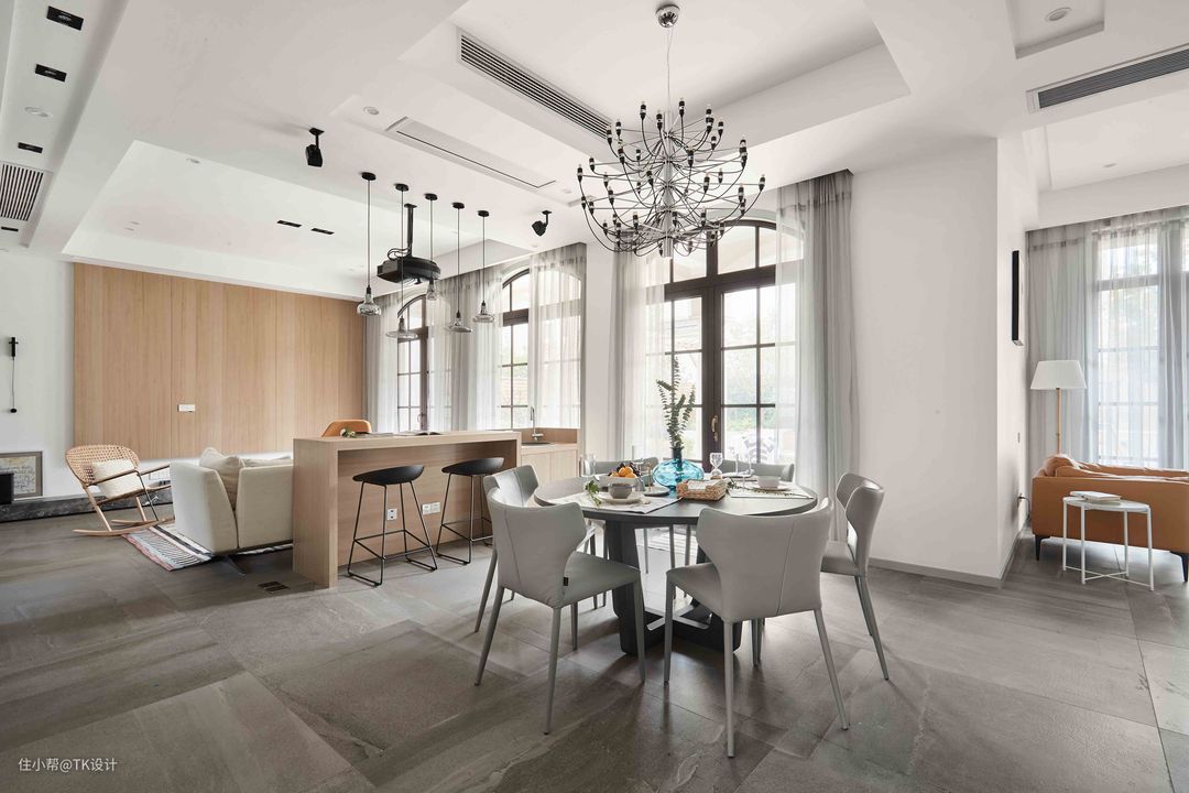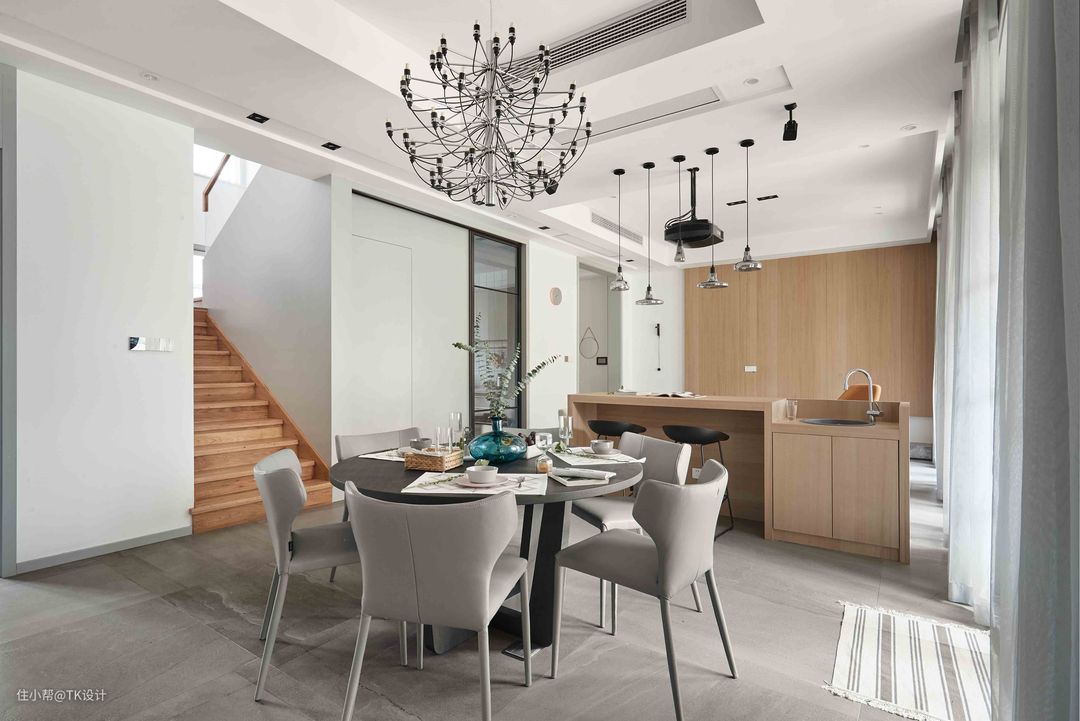 餐厅和客厅之间做了一个吧台,既可以补充客厅的座位,又可以分割两个空间。吧台留出直饮水水槽,方便日常使用。错落的吊灯增添线条感。