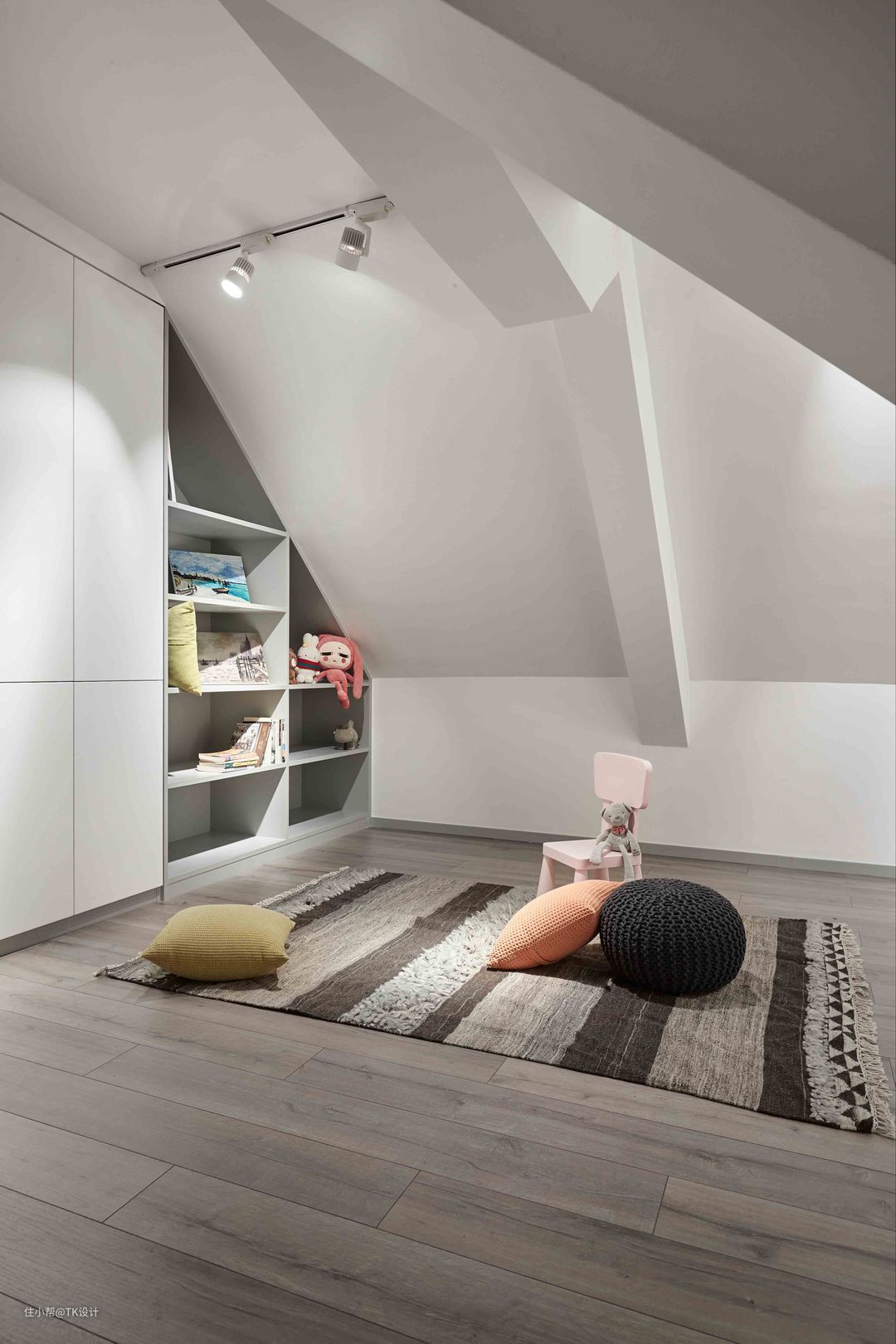 在二楼主卧和儿童房上方搭建出来的小阁楼,作为一小方活动区。 整个楼梯和公共区域轨道都步置了感应灯。