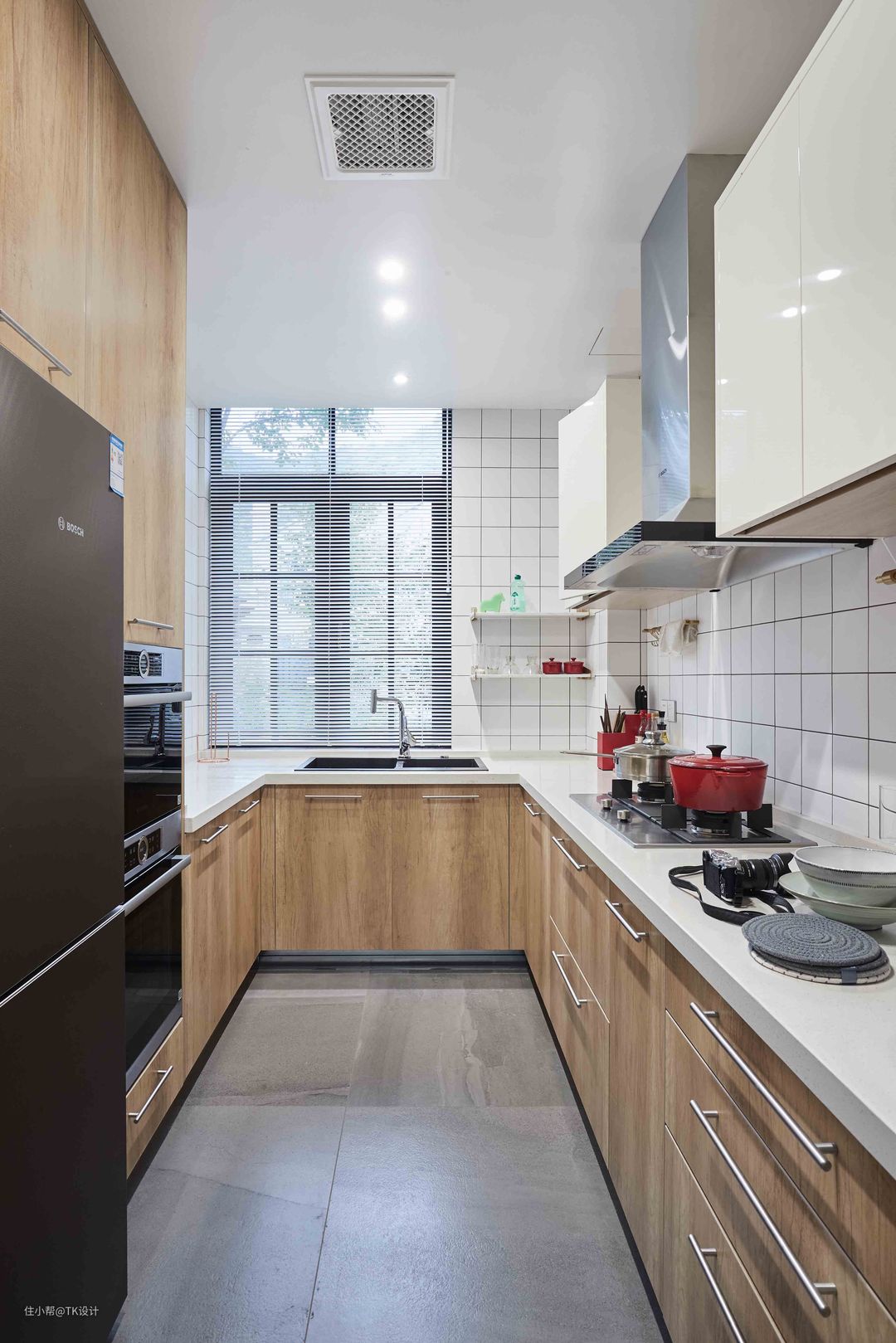 U型厨房。 木色橱柜搭配小白砖,清新简约。