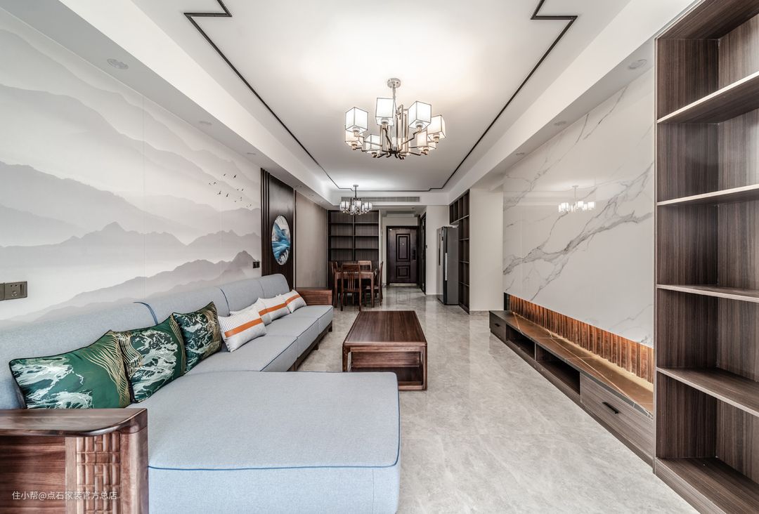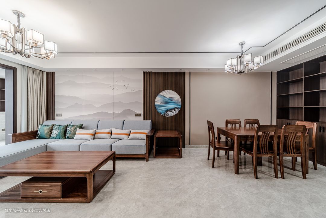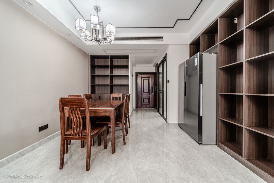 140平米四室两厅两卫新中式风实景案例,玄关到顶悬空鞋柜设计