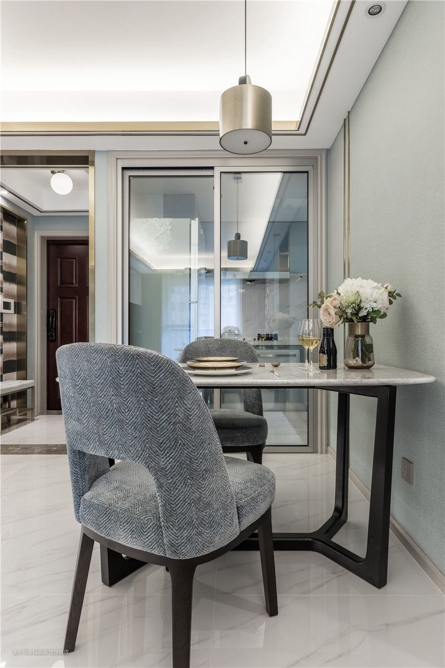 餐桌与茶几选用同款样式;墙面也与客厅保持一致;灰色布艺餐椅简约百搭,非常耐用。