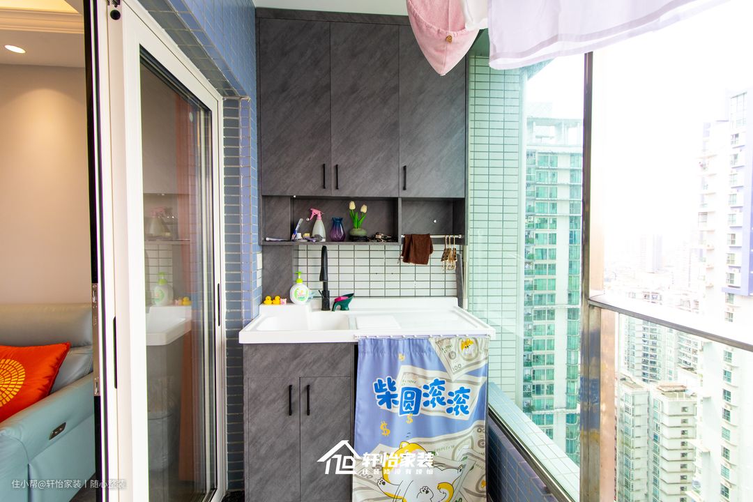 将近落地的大面积玻璃封窗阳台,给整个空间提供了许多自然的采光。 利用凹陷位置嵌入到顶的收纳柜+洗漱台,上半部分做到顶的收纳柜,极大的满足收纳需求,同时下半部分做地柜+洗漱台的结合,满足动线的同时还能让阳台的空间更具整洁有条理,将空间利用到了极致。