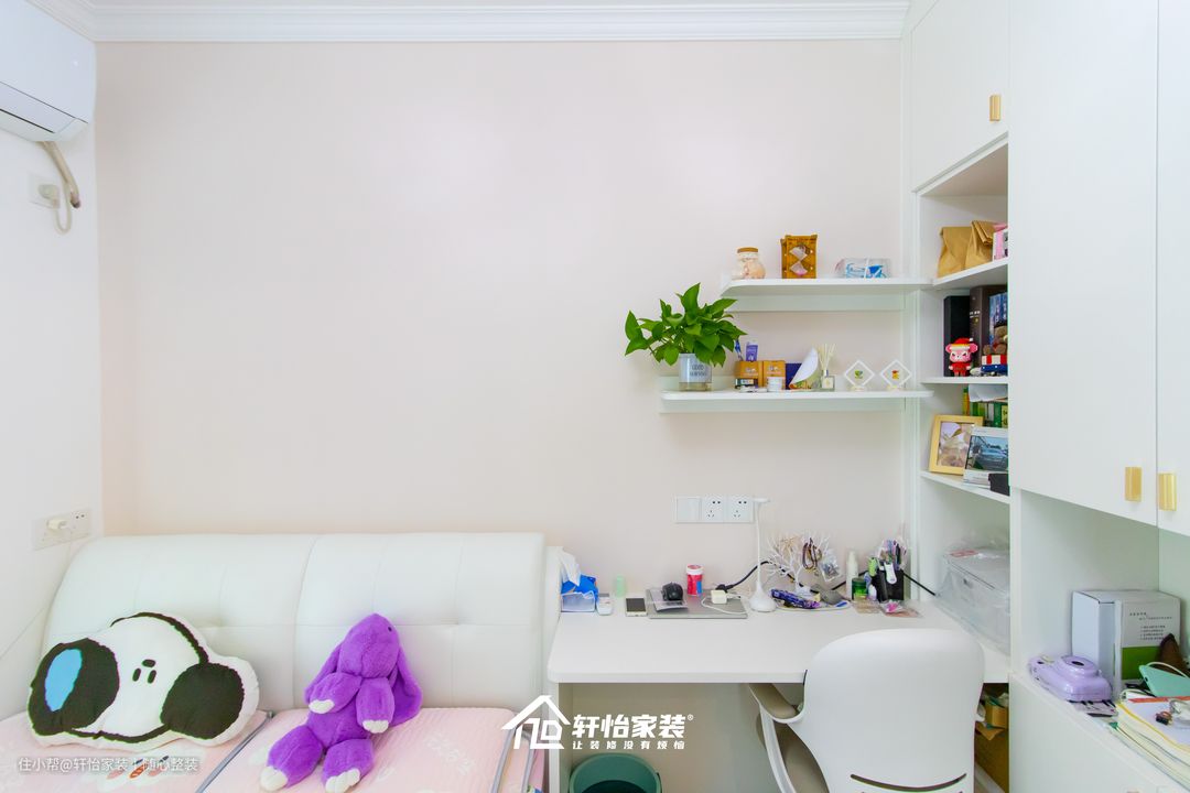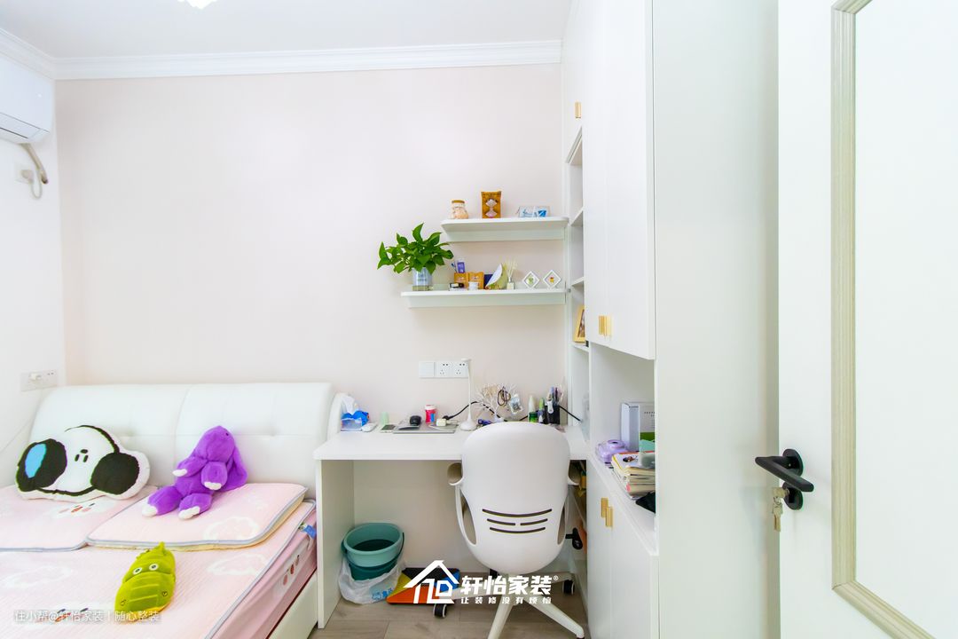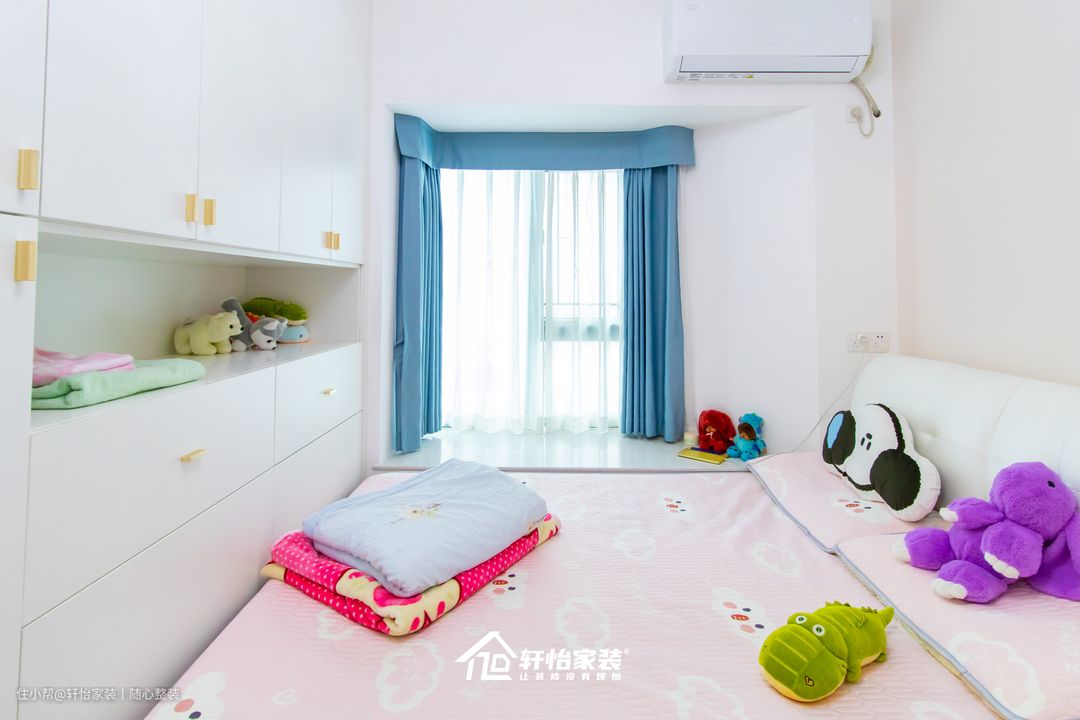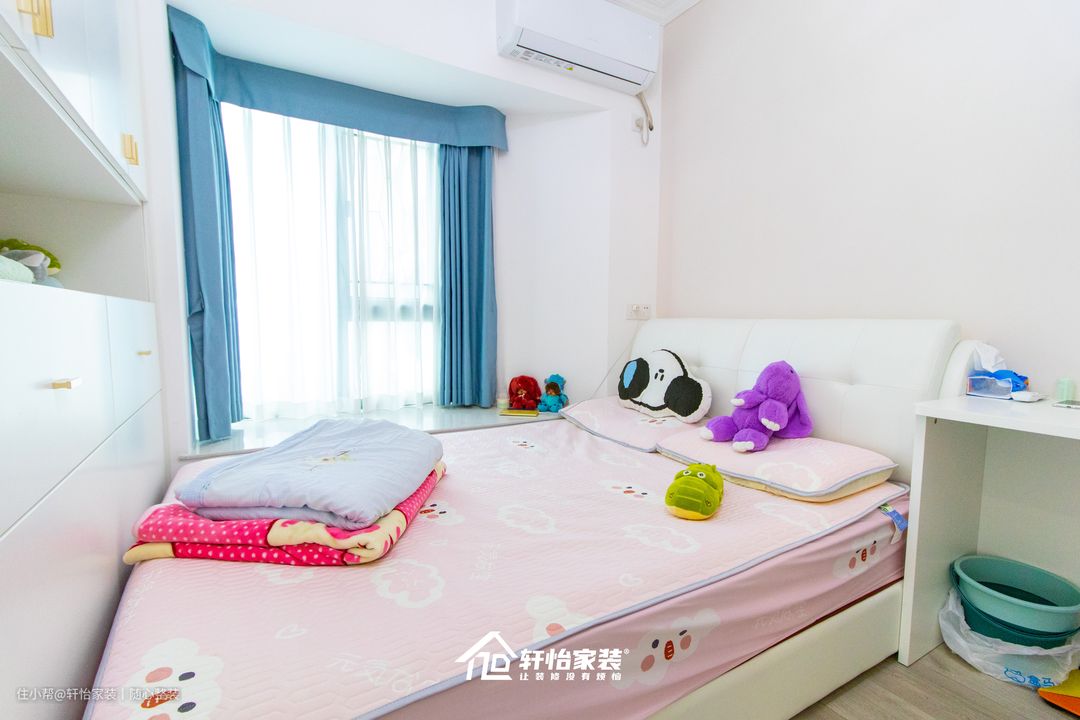 在儿童房设计上不仅符合女儿的审美,在功能性上也非常强大。 白色的床搭配粉色的被套,无形中柔和了卧室氛围,给孩子营造出一个温馨的环境。床高度与飘窗平齐,两者紧贴,减少布局上对空间不必要的切割,视觉上更为宽阔。