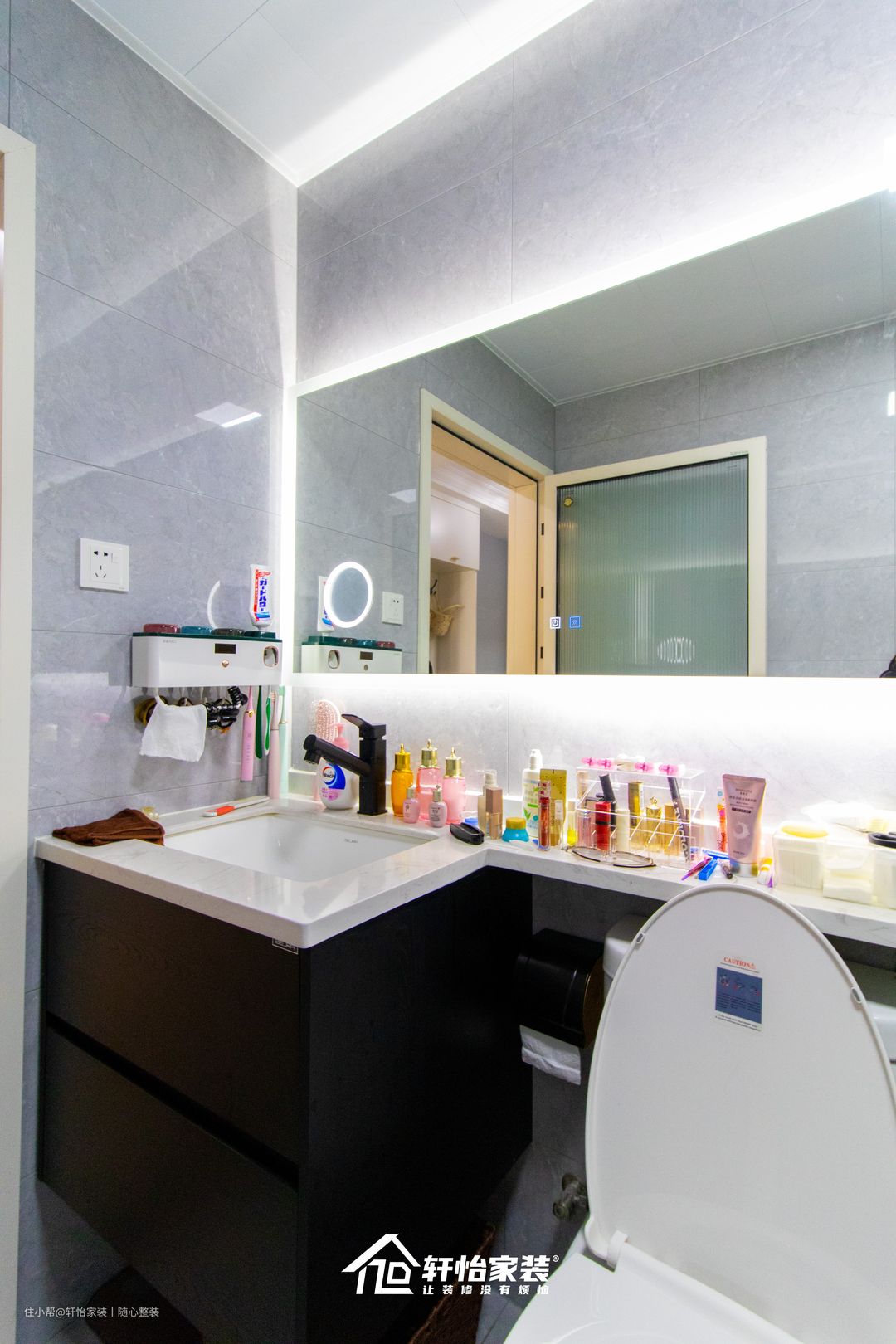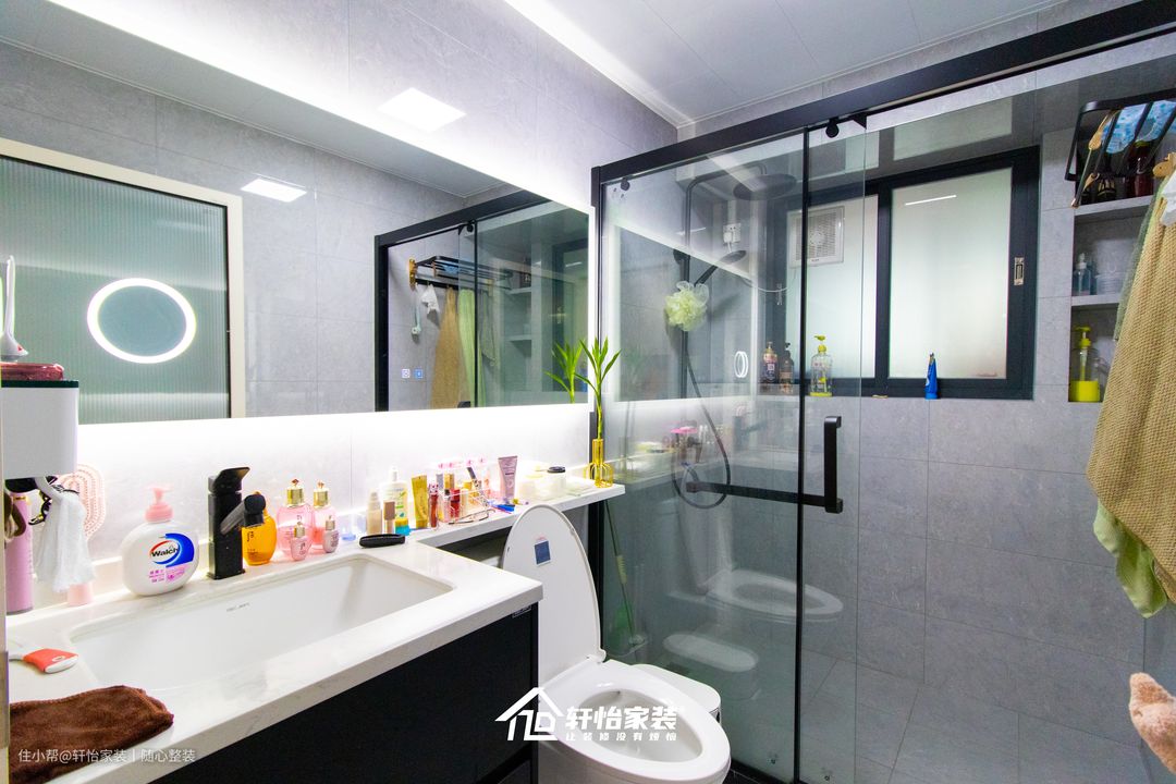 大面积带隐藏灯的梳妆镜,让卫生间视觉得以延伸;同时洗漱台延伸的设计,扩大卫生间的收纳,丝毫不占用外部空间。