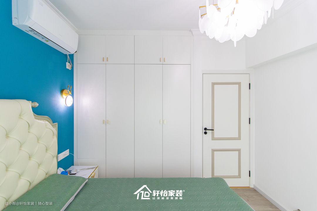 值得一提的是床边到顶的收纳衣柜,大大满足了收纳衣物的需求,整齐的平开门设计密封性好,同时最左侧的一角的收纳柜设置半墙打开设计,延伸出书桌,满足孩子的学习需求和在床上就能随手放置物品,增大生活便利性。