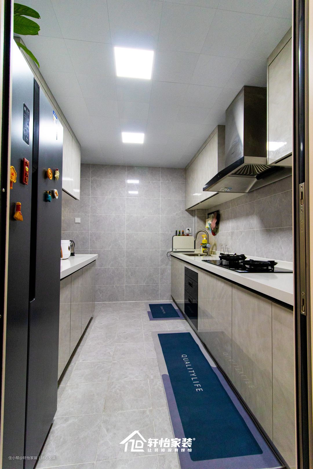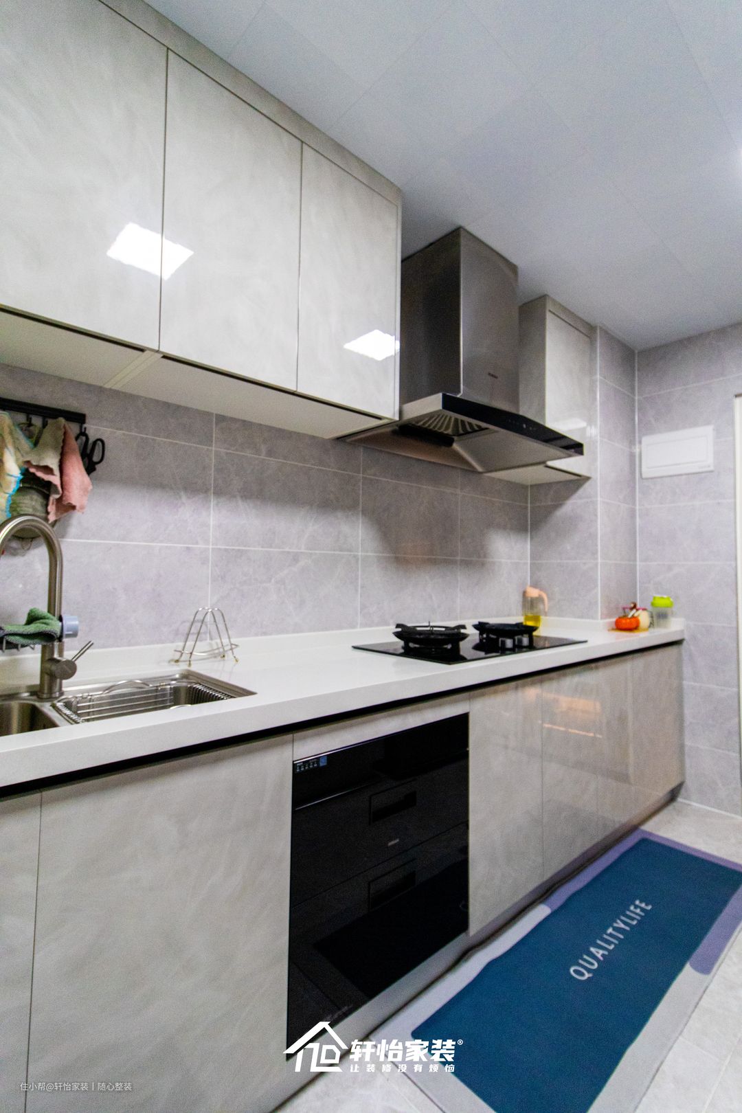 大理石的橱柜使整个厨房的格调上升,厨房虽小,但采用公认最实用的双一字型厨房布局,流水型的取-洗-切-炒,功能区域在一条动线上,没有转角,用起来方便快捷,十分经济优惠。