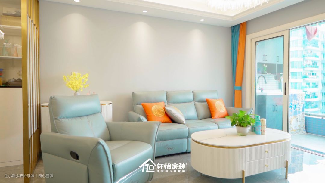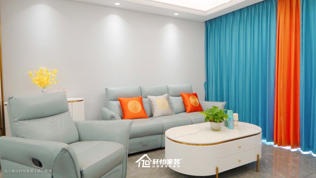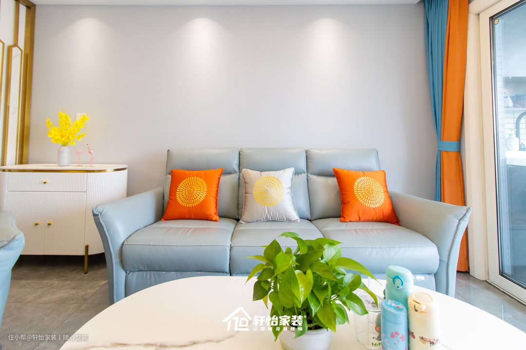 在软装上,搭配宽度达90cm符合人体工学原理的柔软沙发,坐感舒适,疲惫时还能慵懒躺在沙发上。橙色系的抱枕和窗帘遥相呼应,提升空间简美的氛围感,这简直就是将功能与简约生活完美诠释,彰显业主极简的生活态度。