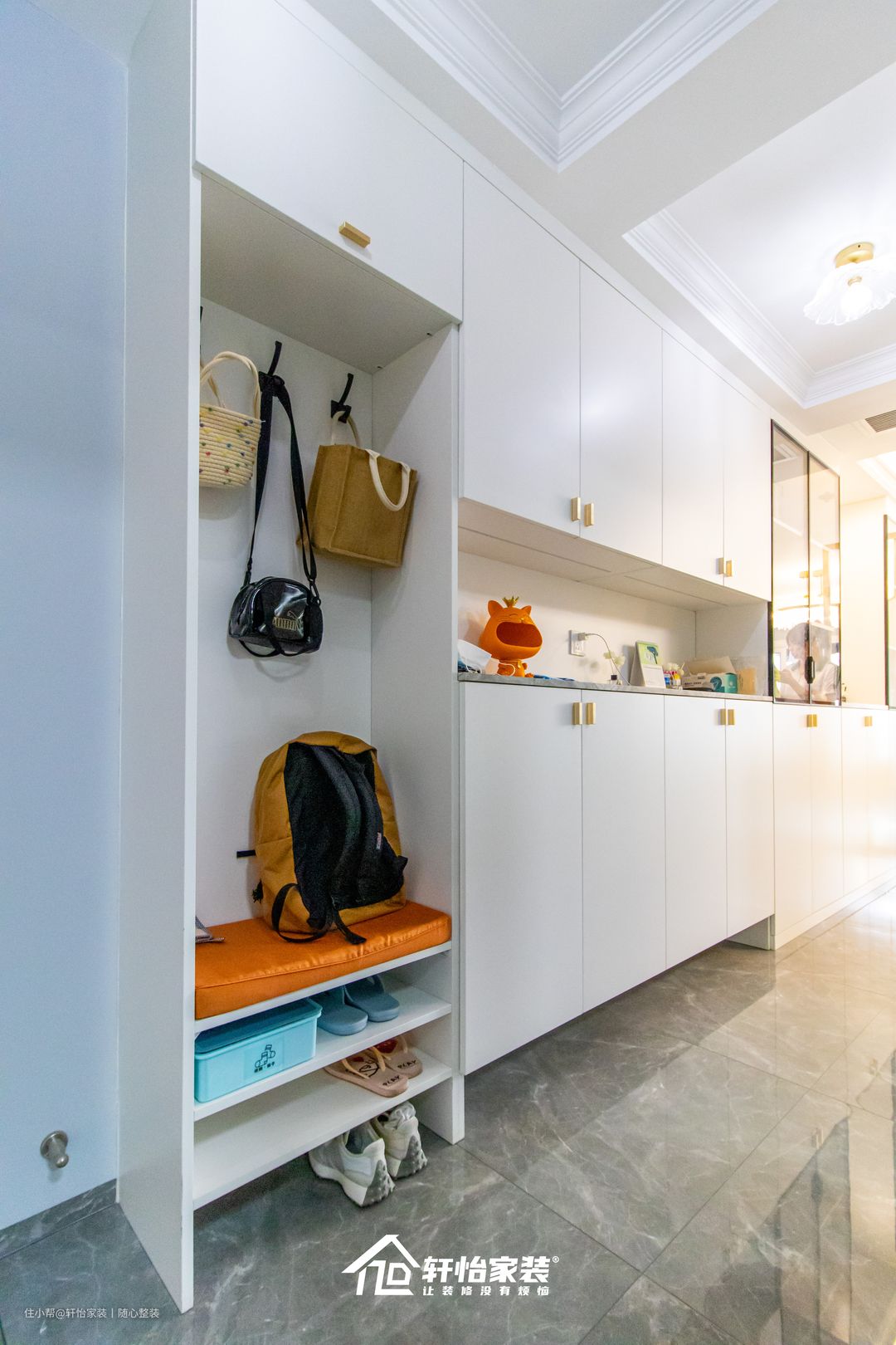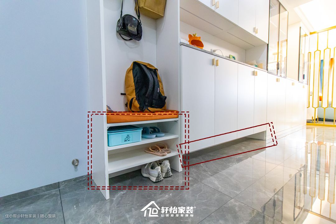 卡座换鞋凳的加入,凳子底下做了分层600mm的镂空,方便鞋子的摆放和取用,还能缓解鞋子的异味;同时柜体中间还预留挂钩,极大提高业主的入户便利性。