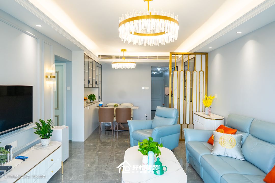 以人为本的设计,意在打造一个简美温馨的的空间。 客厅的简约与美式的气质相结合,散发着简约又不失清新的优雅格调。房屋采光好,阳光透过窗帘照进客厅,在主灯和射灯映衬下的客厅,满是生活的气息,温暖极了!!