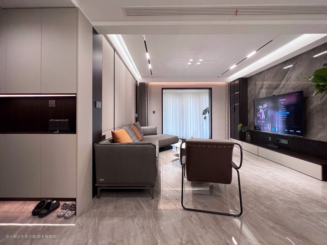 客厅以黑白灰色调为主,公共区域通铺上60*120的灰色通釉砖,在光影的照射下,看上去更宽敞明亮。