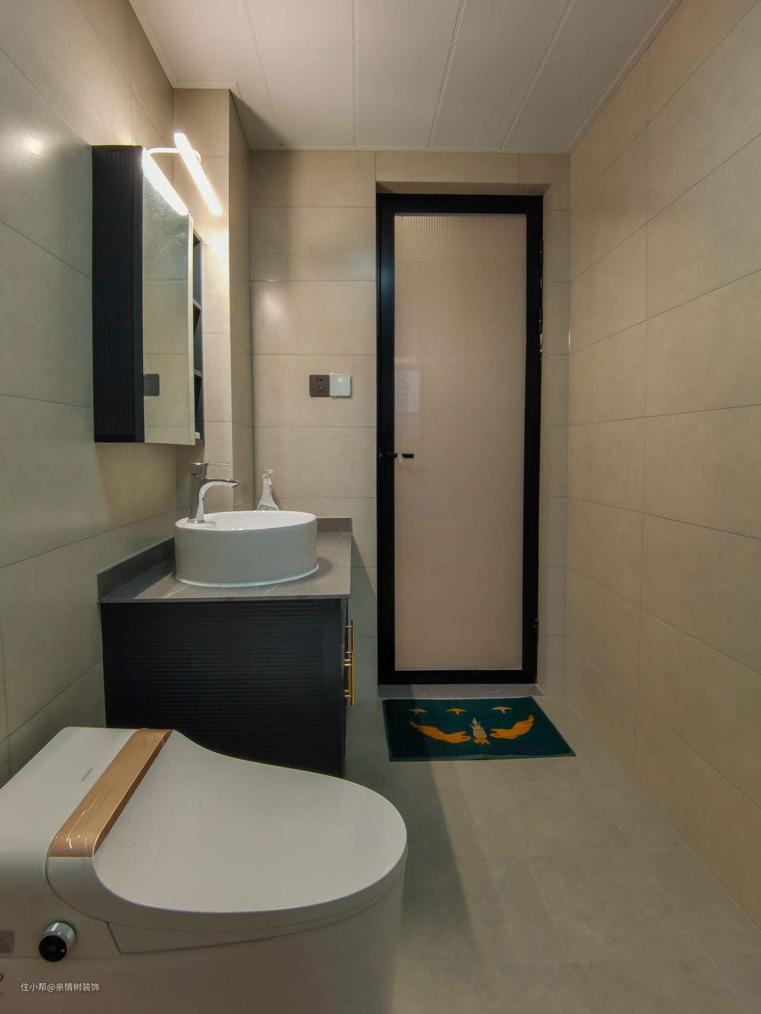 卫生间以浅灰色的墙面与地面,智能马桶采取壁挂设计,为主人提供了一个简约大方而实用的卫浴体验