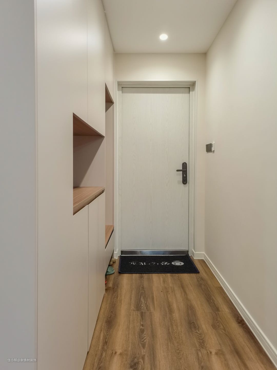 入门右侧是玄关,定制了一整排的收纳柜,下方开放区可以直接更换鞋子,中间开放格可以随手放钥匙及消毒物品