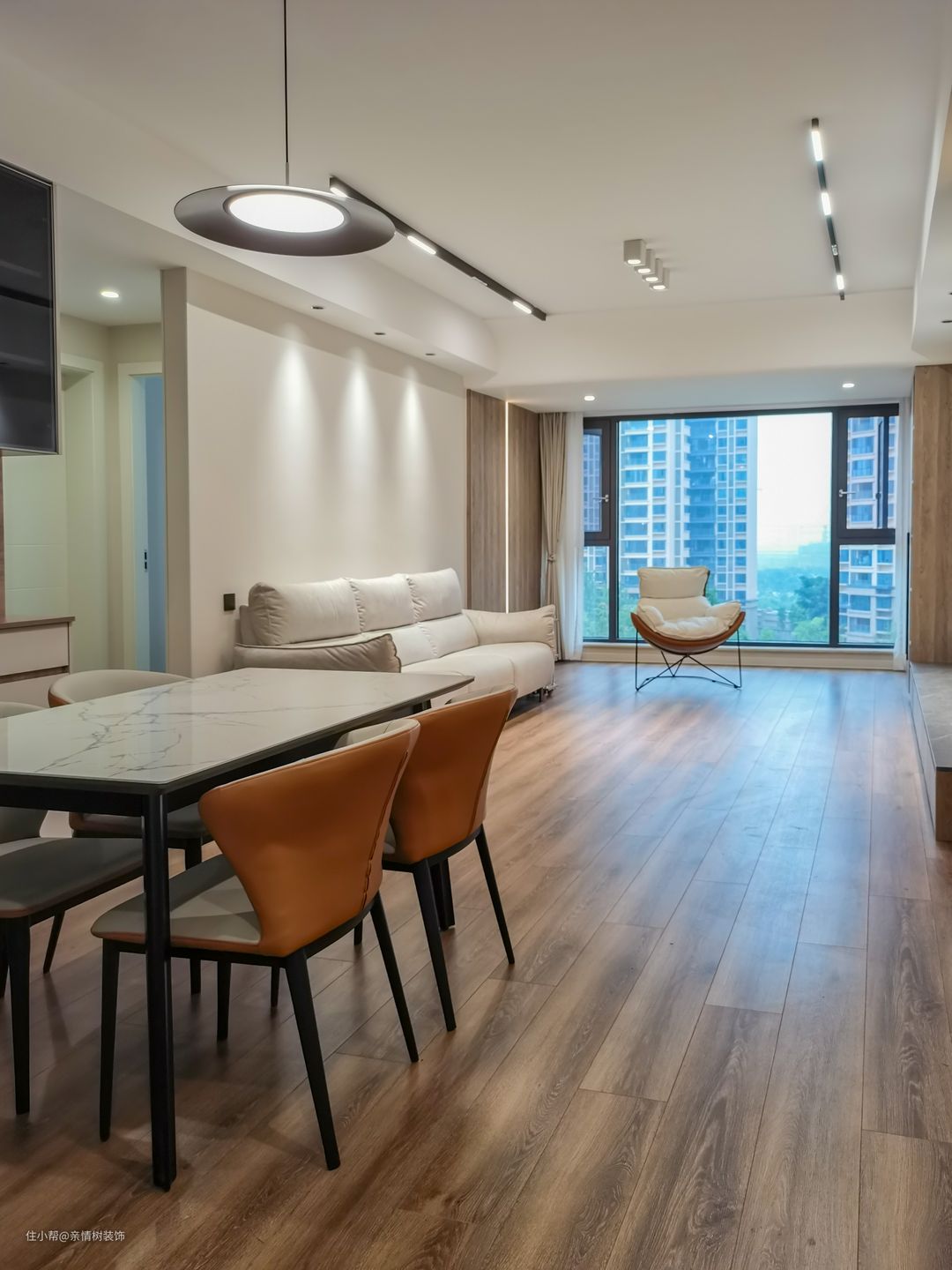 现代风的客厅,客餐厅一连化,木地板通铺客餐厅,实用又环保,加上现代轻奢的真皮羽绒白色的沙发,阳台放着一张北欧INS风的摇摇单人椅,大花板以无主灯的设计,灯筒+灯带时尚又显得不单调。