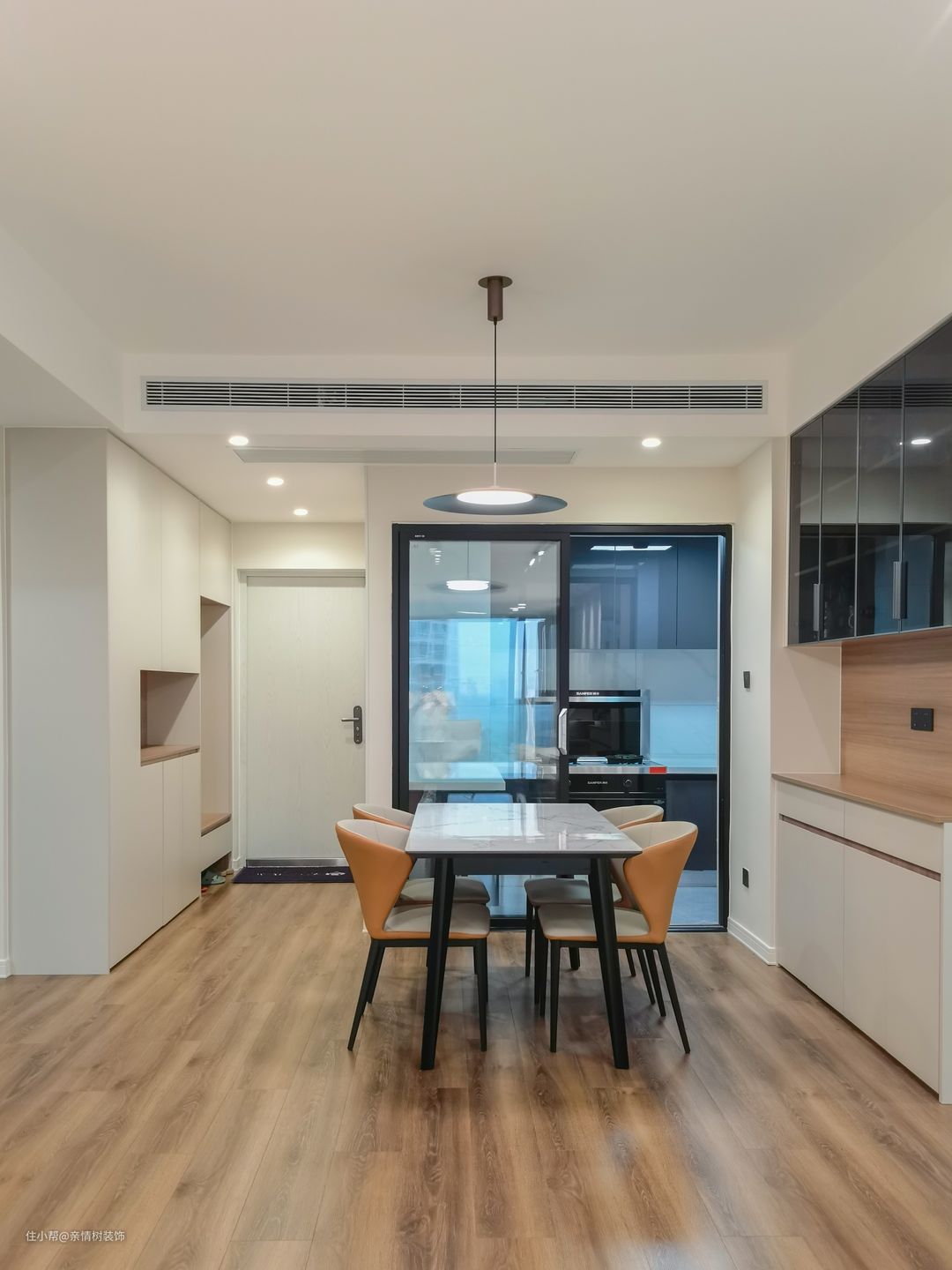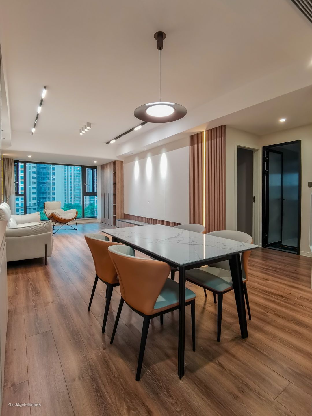 餐厅,简约的岩板高端轻奢餐桌,搭配着棕色的皮艺餐椅,黑色脚架。现代简约飞碟吊灯,是年轻人的喜好。餐厅与客厅互通的空间,让整个空间显得更大气