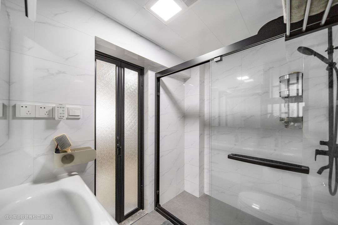 卫生间每个功能划分明确,整体黑白灰色调,不仅符合屋主的生活习惯,并且考虑到以后宝宝的泡澡区,窗台下方选择“留空”设计,能让日常洗浴和深度清洁得到完美融合,营造精致优雅的轻松感。