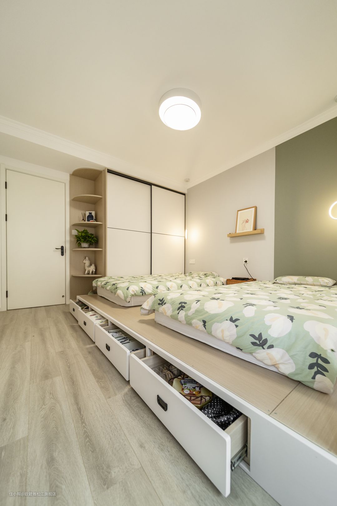 小小的卧室地台,却在简单平整中增添了多个收纳空间,各种抽屉设计,分门别类的摆放各种生活物品,条理性十足。