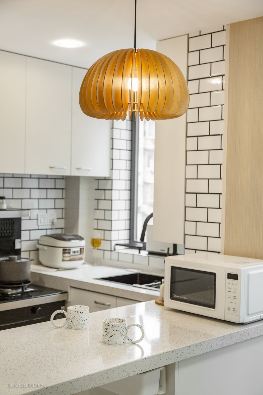平面布置改造: 通过拆除厨房部分墙体,不仅完美解决了空间的局促感,还让日常家庭互动诉求得到解决。开放式的厨房搭配小吧台,也使烹饪、就餐、收纳等一系列功能得到完善。正所谓,到处皆诗境,随时有物华。