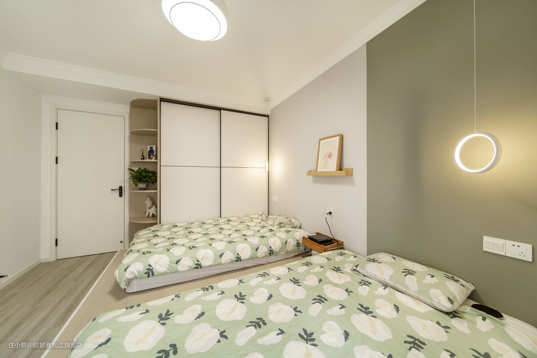 背景墙采用珊瑚绿、浅灰色组合,搭配同色系的床品,散发骨子里的小清新!原木置物架与装饰画的点缀给人一种清新而又简约的文艺感!