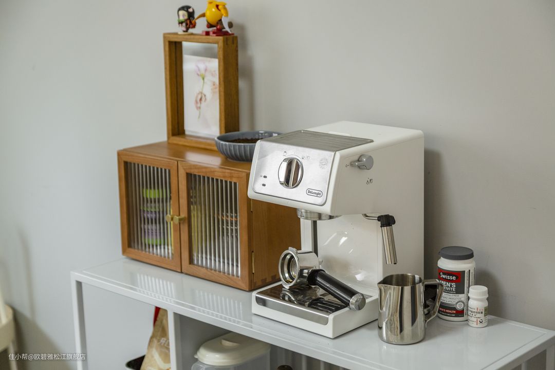 小面积的原木风采用也丰富了客厅的色彩,维护深色和浅色的平衡。都说生活需要一些仪式感,一旁的咖啡机可以让自己在休闲时刻动手研磨一杯浓郁的咖啡,随风扑来的清香感静静书写生活中每一天的小确幸.....