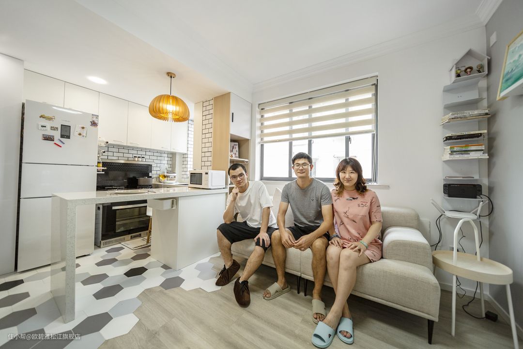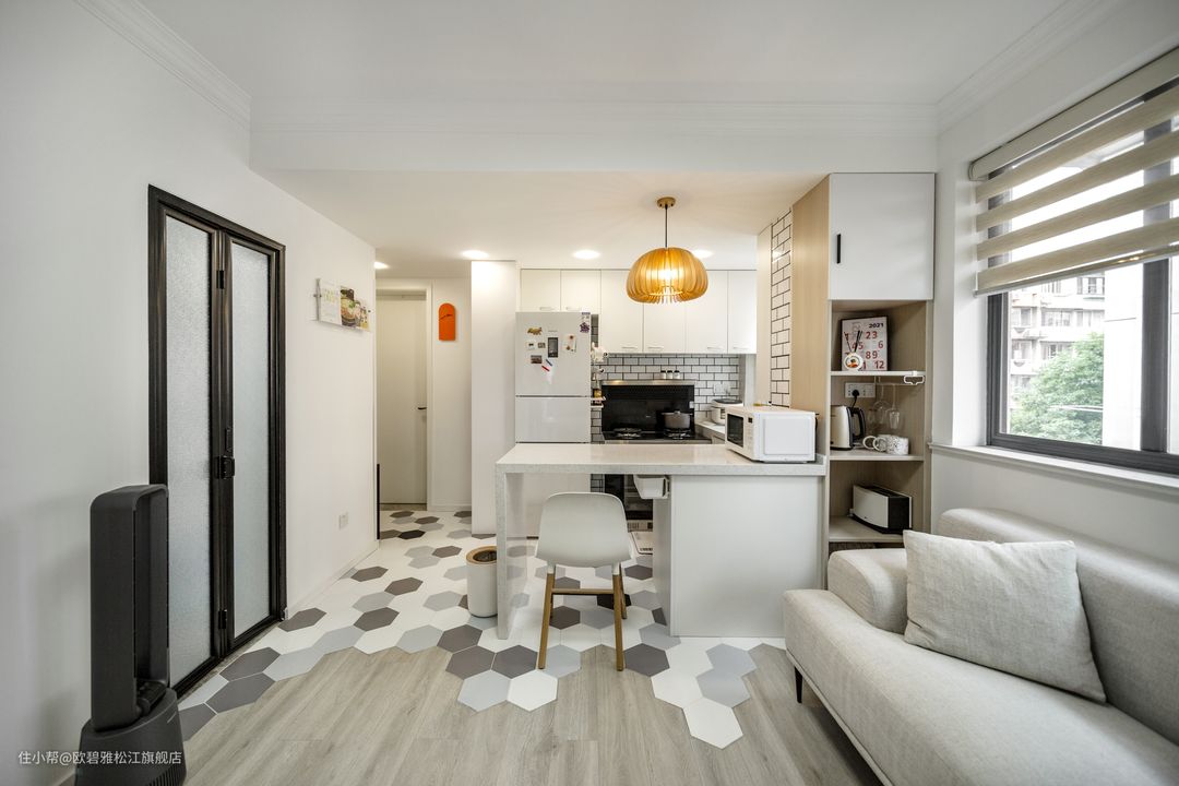 打通之后的客餐厨采用令人舒适的自然色调,实木多层木地板搭配灰白色六角瓷砖,加上由石英石组成的吧台餐桌,上方点缀一些局部色系的吊灯丰富空间的色彩,整个空间的质感得到了提升。