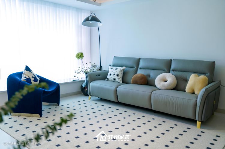 简约温馨是整个客厅的设计调性,以白色为主配色,整面白墙没有过多繁杂的装饰品,与地上的小格子地毯形成鲜明的对比,用一张灰色长沙发和一盏灰色大罩灯作为客厅的主要软装配饰,简约不单调,再配上一张深蓝色单人沙发,层次鲜明的配色搭配,格调生活一整个拉满。