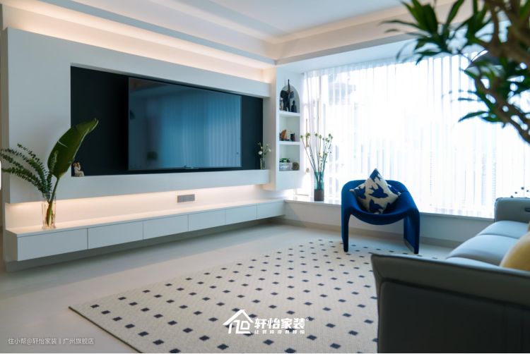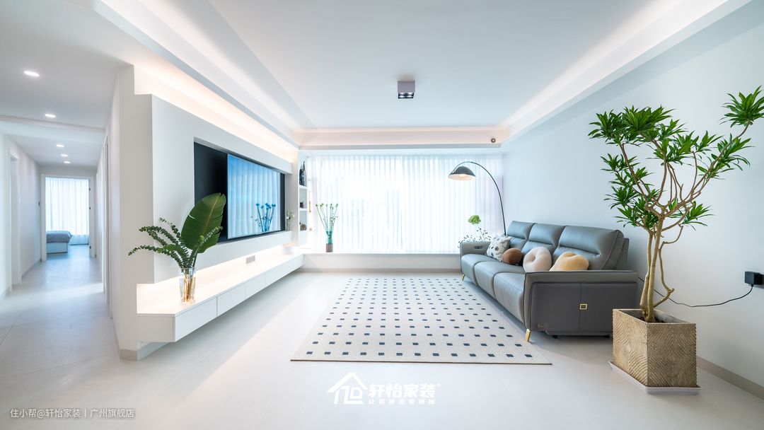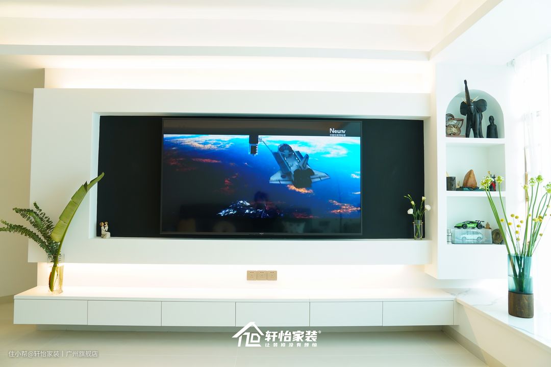 整面白色电视背景墙做成一字型设计,电视做了内嵌处理,两边留位作为小饰品摆放,简约的抽屉地柜,同时满足收纳与展示的功能,高端大气的气质一呼而出。