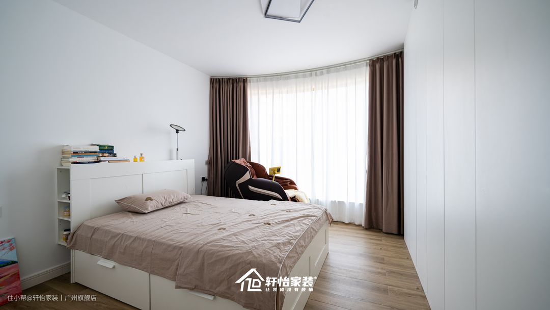 主卧整体十分通透明亮,归功于大大的弧形落地窗。其次主卧的收纳功能也是一大设计亮点,榻榻米布局+靠背柜收纳一体化设计,对于收纳需求强烈的业主是十分友好的。